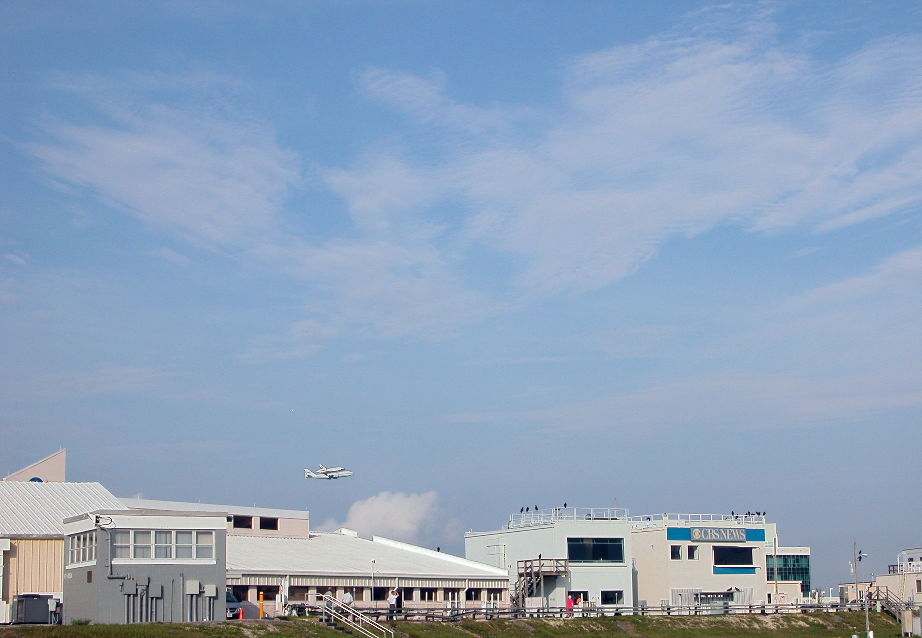 On a morning where broken clouds filled the sky of Central Florida, the shuttle carrier aircraft, or SCA, and its passenger Atlantis ease their way past the NASA News Center for a landing at the KSC Shuttle Landing Facility, known as the SLF. The aircraft is a modified Boeing 747 jetliner Atlantis landed at Edwards Air Force Base in California to end mission STS-117. The return to KSC began July 1 and took three days after stops across the country for fuel. The last stop was at Ft. Campbell in Kentucky. Weather conditions over the last leg postponed the return trip until July 3. Touchdown was at 8:27 a.m. EDT. Atlantis will be removed from the back of the SCA via the mate/demate device at the SLF. It will then be towed to the Orbiter Processing Facility to begin processing for its next launch, mission STS-122 in December.