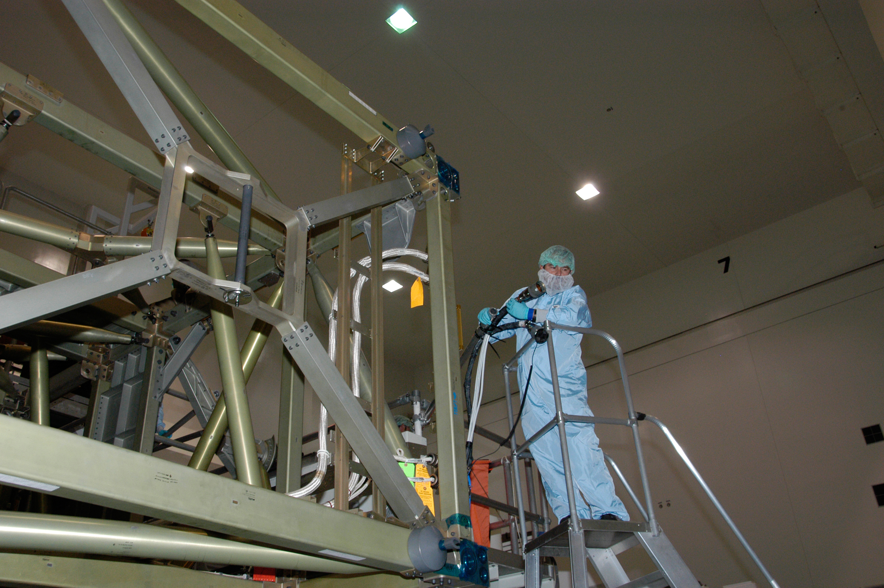 In the Space Station Processing Facility at NASA's Kennedy Space Center, a worker holds a cable that will help recharge the battery for the S6 integrated truss. The final starboard truss in the assembly of the International Space Station, the S6 is scheduled to fly on space shuttle mission STS-119, whose launch date is not yet determined.