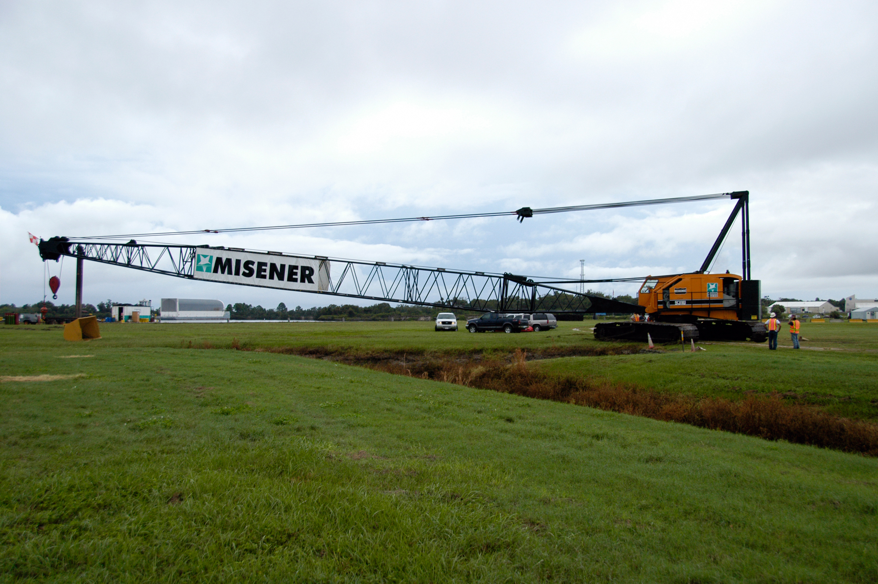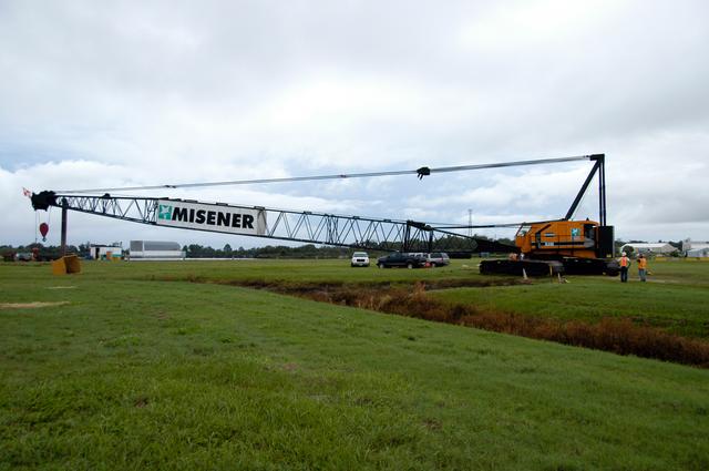 A large crawler crane begins moving away from the turn basin at the Launch Complex 39 Area on NASA's Kennedy Space Center. The crane with its 70-foot boom will be moved to Launch Pad 39B and used to construct a new lightning protection system for the Constellation Program and Ares/Orion launches. Pad B will be the site of the first Ares vehicle launch, including Ares I-X which is scheduled for April 2009.