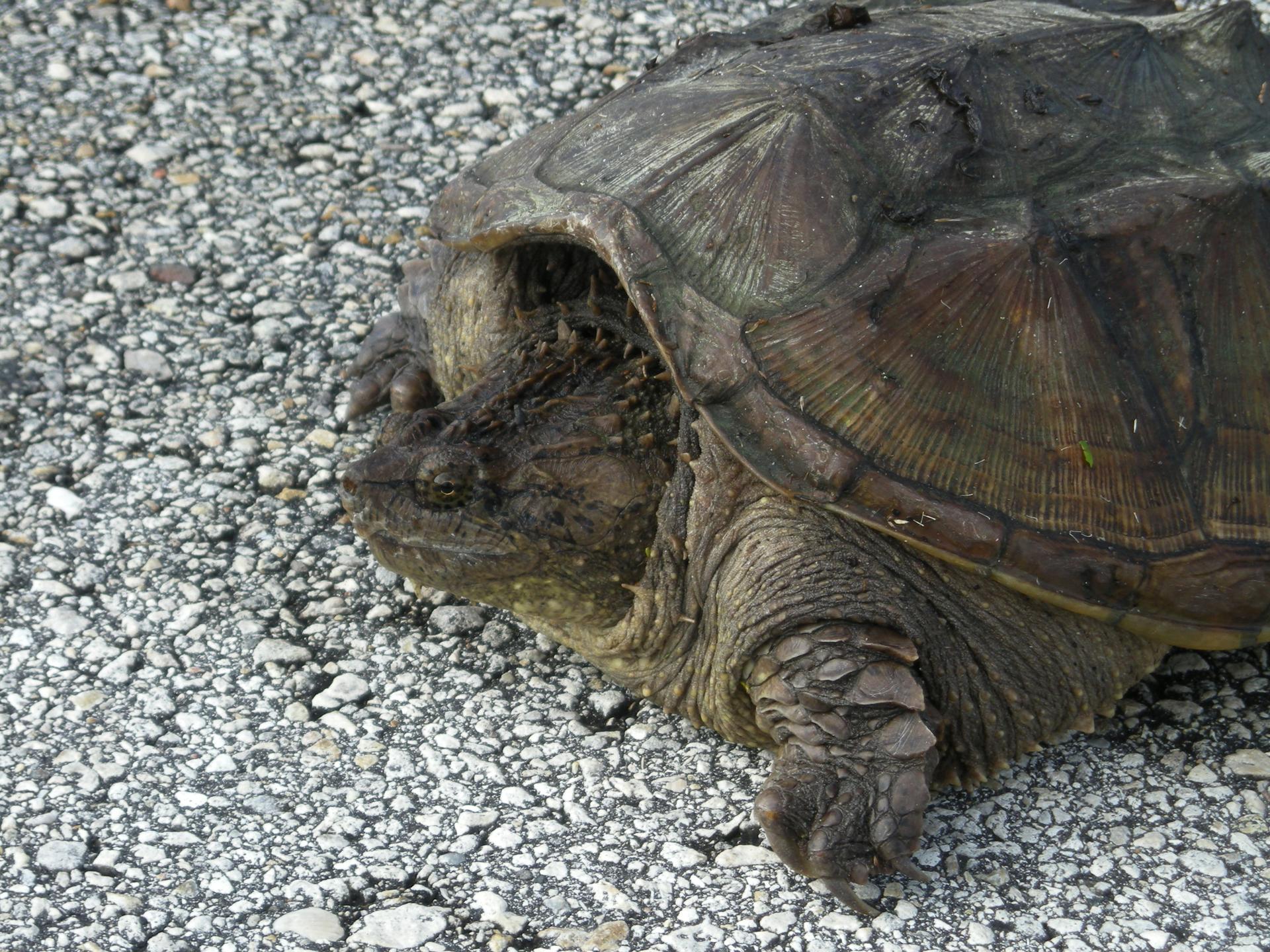 A rare photo of a Florida snapping turtle out in the open on Beach Road, near NASA's Kennedy Space Center. Found only in Florida and Georgia, this species is related to the common snapping turtle. It is considered a dangerous turtle because it can snap very quickly with its extremely strong jaws. Its tail, which is almost as long as its shell, has saw-edges along the top. The shell also has rough points down the middle. The shell is tan to dark brown and may have green algae growing on it. It can grow to 17 inches long and weigh 45 pounds. Snapping turtles usually live in ponds under the shadows and don’t like to rest in the sun like most turtles. They eat almost anything: water bugs, fish, lizards, small birds, mice, plants and even dead animals.