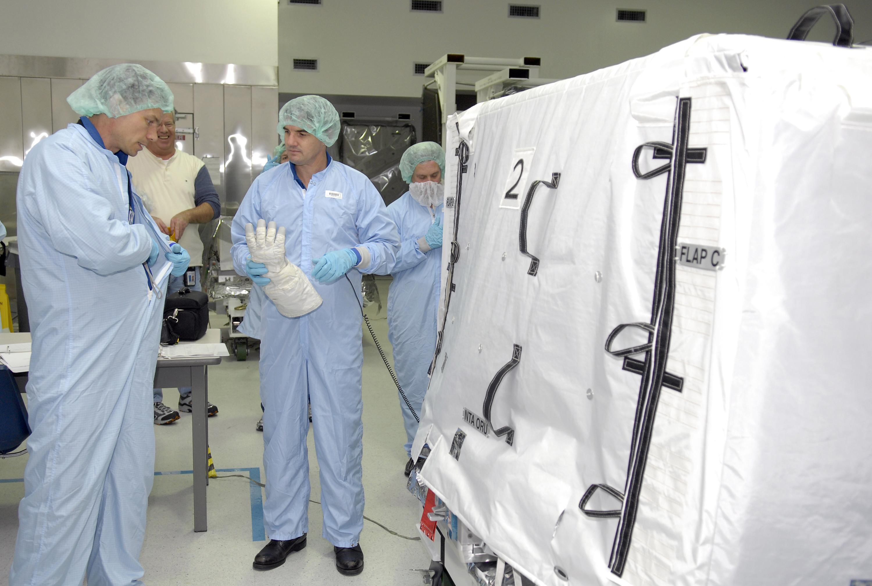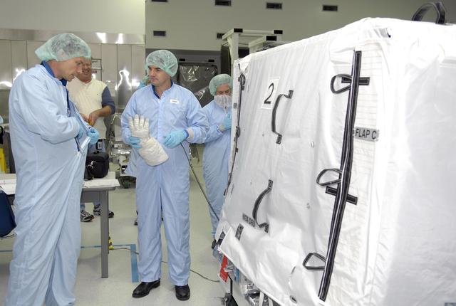 KENNEDY SPACE CENTER, FLA. -- In the Space Station Processing Facility, STS-122 crew members get a close look at the Multi-Purpose Experiment Support Structure - Non-Deployable (MPESS-ND), part of the payload on their mission. Seen here in the foreground are Mission Specialists Stan Love (left) and Rex Walheim. The crew is participating in a crew equipment interface test that provides opportunities for hands-on experience with payloads and equipment. The other crew members are Commander Steve Frick, Pilot Alan Poindexter and Mission Specialists Leland Melvin and Hans Schlegel, who represents the European Space Agency. The 24th mission to the International Space Station, STS-122 will also include the Columbus European Laboratory. Launch of STS-122 on Space Shuttle Discovery is scheduled no earlier than October. Photo credit: NASA/Kim Shiflett