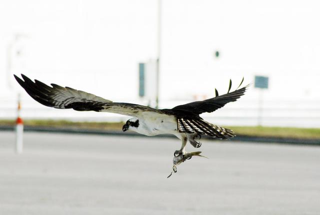 KENNEDY SPACE CENTER, FLA. -- Near the Kennedy Space Center News Center, in the Launch Complex 39 area, a male Osprey takes flight with part of a fish clutched in its talons. The bird is one of more than 500 species of birds that co-exist at the Center and the Merritt Island National Wildlife Refuge. Photo credit: NASA/Ken Thornsley
