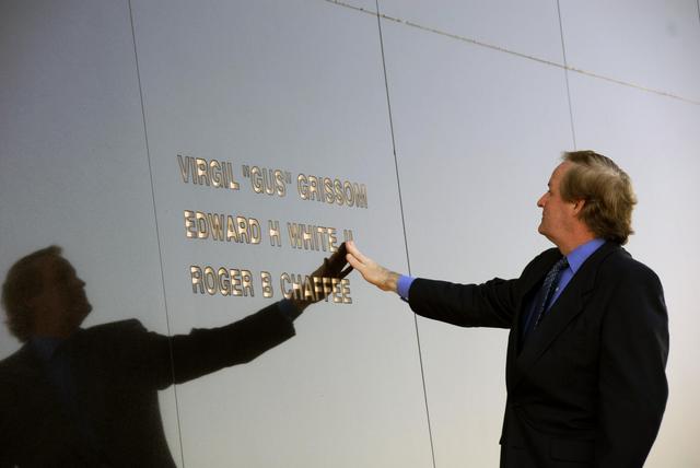 KENNEDY SPACE CENTER, FLA. -- Ed White III touches his father's name engraved in the Space Mirror Memorial at the KSC Visitor Complex. White attended the ceremony held in remembrance of the astronauts lost in the Apollo 1 fire: Virgil "Gus" Grissom, Edward H. White II and Roger B. Chaffee. Members of their families, along with KSC Director Bill Parsons, Associate Administrator for Space Operations William Gerstenmaier, President of the Astronauts Memorial Foundation Stephen Feldman and Chairman of the Board of Directors of the Astronauts Memorial Foundation William Potter, attended the ceremony. The mirror was designated as a national memorial by Congress and President George Bush in 1991 to honor fallen astronauts. Their names are emblazoned on the monument’s 42-½-foot-high by 50-foot-wide black granite surface as if to be projected into the heavens. Photo credit:NASA/Kim Shiflett