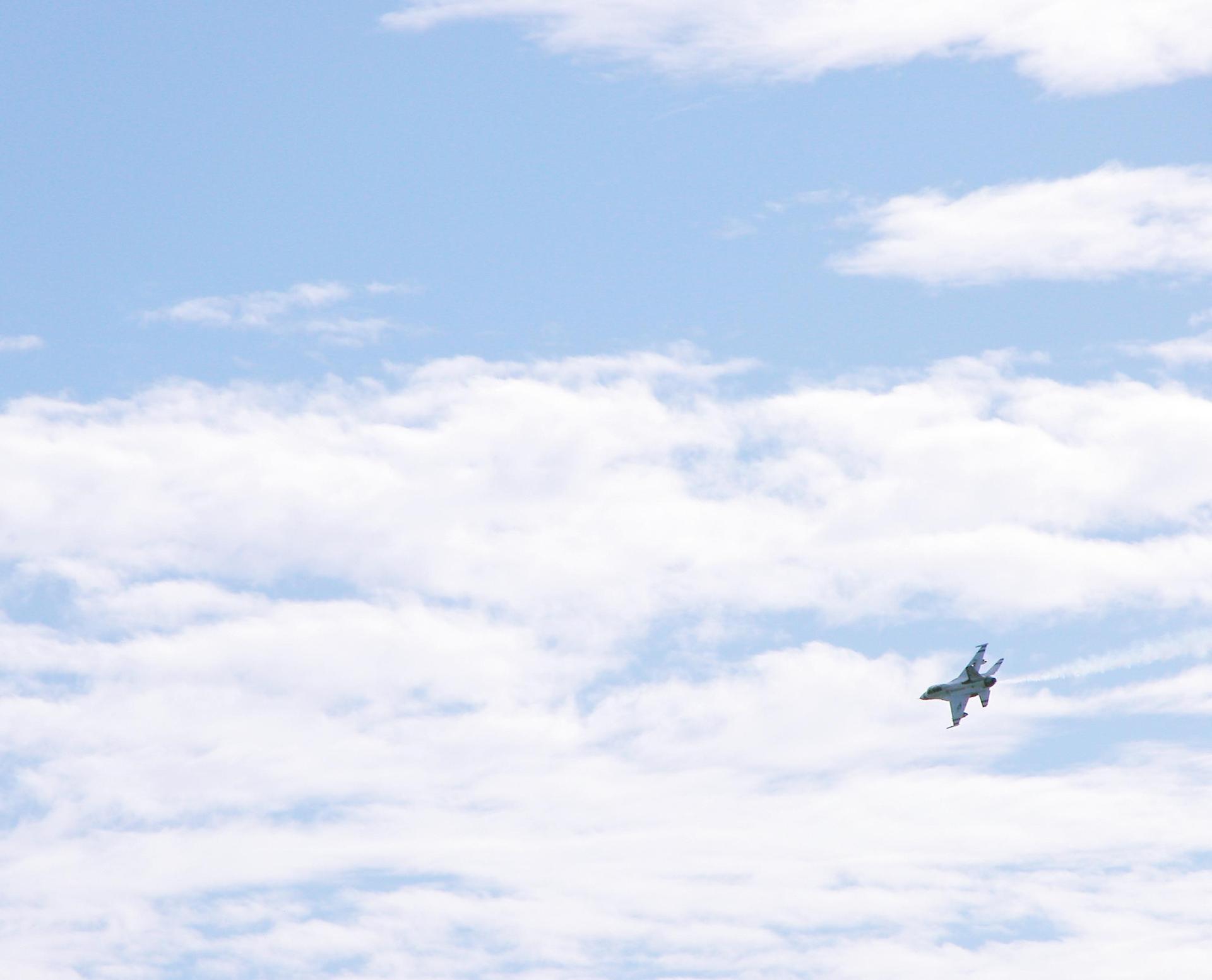KENNEDY SPACE CENTER, FLA. -- Silhouetted against the cloud-strewn sky over NASA's Kennedy Space Center, a U.S. Air Force Thunderbird F-16D aircraft displays its prowess. The pilot is Maj. Tad Clark, who, after landing at the Shuttle Landing Facility, announced that Kennedy Space Center Visitor Complex will host the inaugural World Space Expo from Nov. 3 to 11, featuring an aerial salute by the Thunderbirds on its opening weekend. The Expo will create one of the largest displays of space artifacts, hardware and personalities ever assembled in one location with the objective to inspire, educate and engage the public by highlighting the achievements and benefits of space exploration. Photo credit: NASA/Debbi Odom