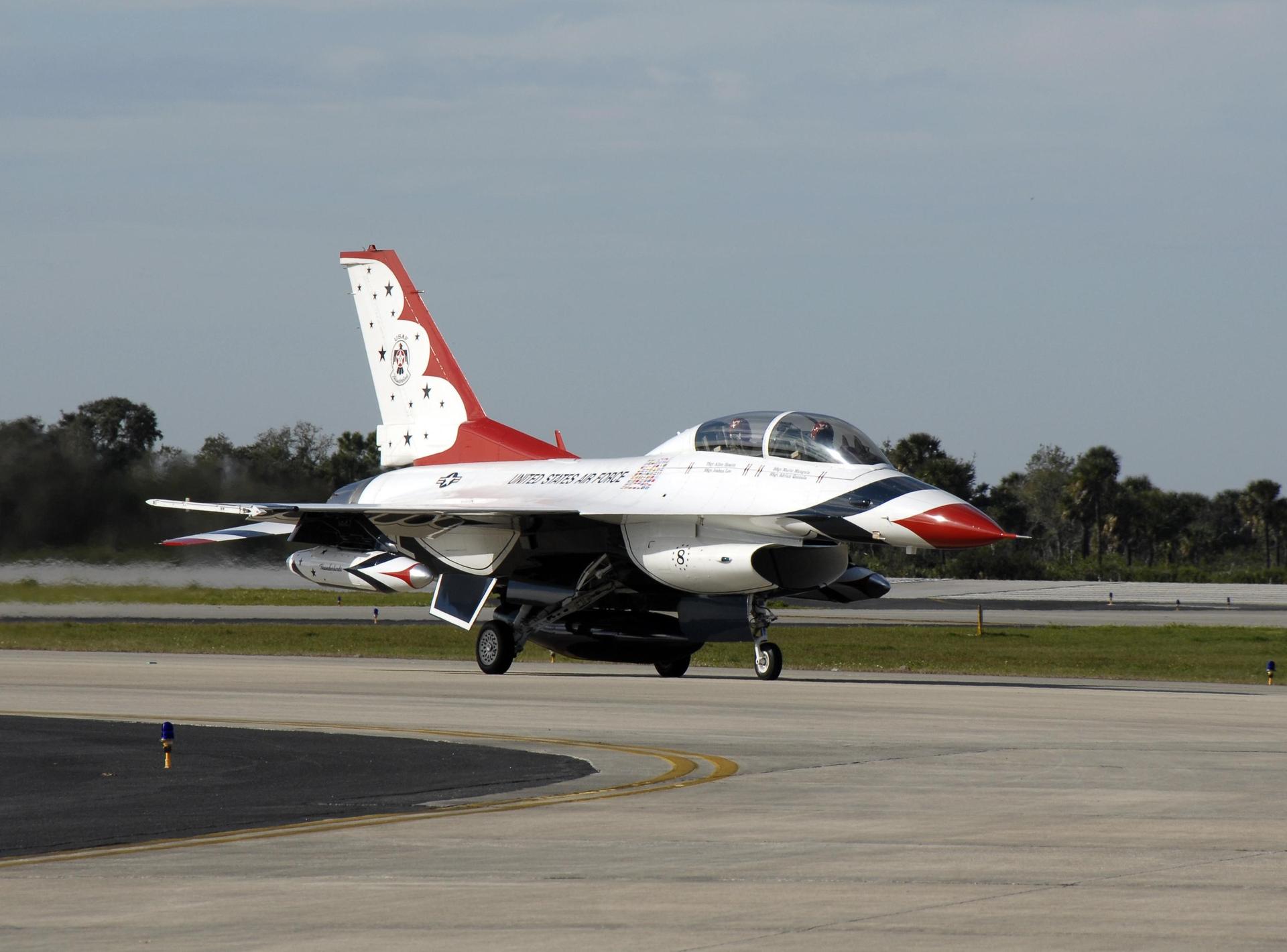 KENNEDY SPACE CENTER, FLA. -- A U.S. Air Force Thunderbird F-16D aircraft taxis down the runway at the Kennedy Space Center Shuttle Landing Facility. The pilot is Maj. Tad Clark, who announced to waiting media that Kennedy Space Center Visitor Complex will host the inaugural World Space Expo from Nov. 3 to 11. The Expo, which will feature an aerial salute by the Thunderbirds on its opening weekend, will create one of the largest displays of space artifacts, hardware and personalities ever assembled in one location with the objective to inspire, educate and engage the public by highlighting the achievements and benefits of space exploration. Photo credit: NASA/Kim Shiflett