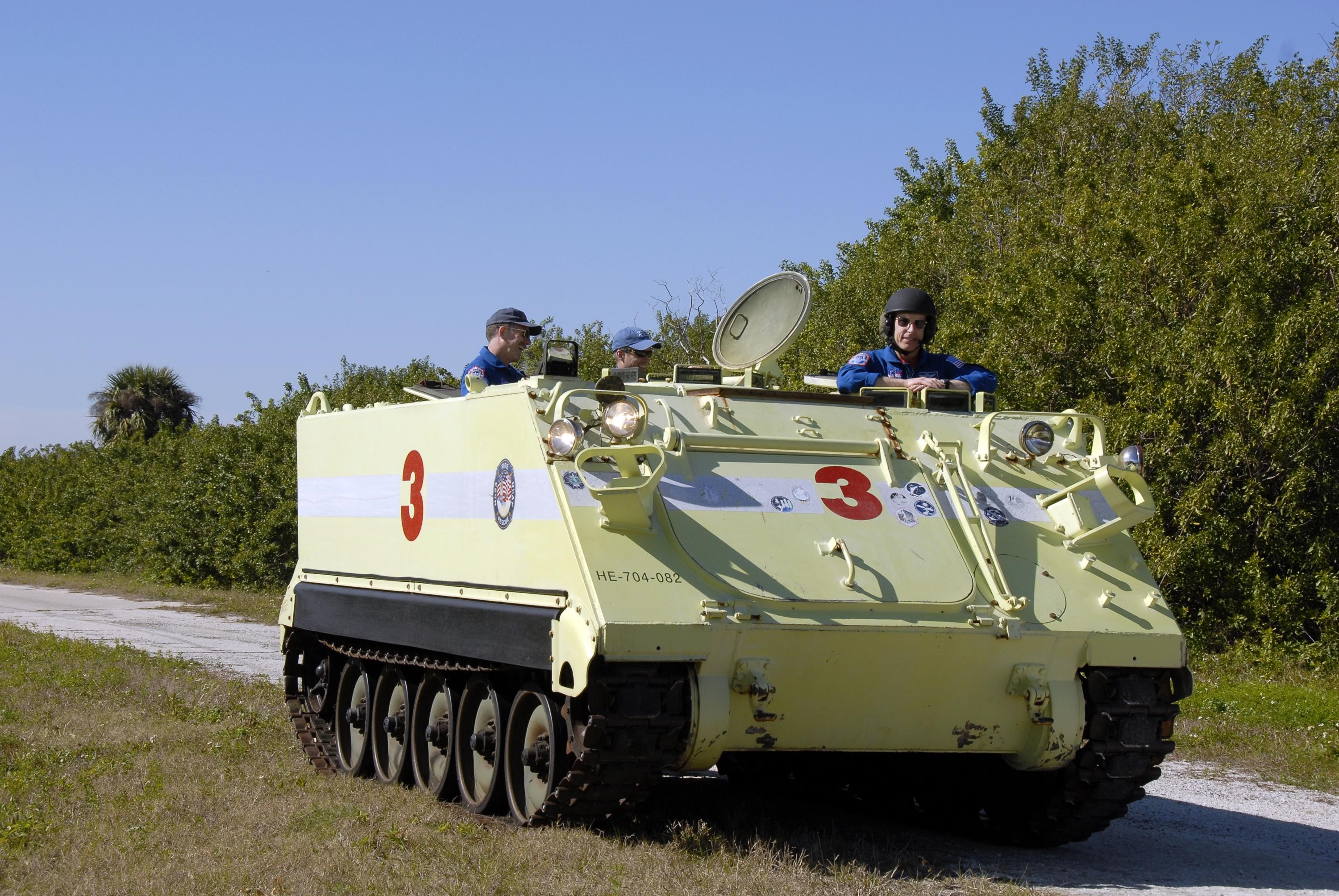 KENNEDY SPACE CENTER, FLA. -- At Launch Complex 39, STS-117 Mission Specialist Patrick Forrester (right) waits his turn to practice driving an M-113 armored personnel carrier as fellow crew members look on. The astronauts on the STS-117 crew are participating in M-113 armored personnel carrier training during Terminal Countdown Demonstration Test (TCDT) activities, a dress rehearsal for their launch, targeted for March 15. The M-113 could be used to move the crew away from the launch pad quickly in the event of an emergency. The TCDT also includes pad emergency egress training and a simulated launch countdown. The mission payload aboard Space Shuttle Atlantis is the S3/S4 integrated truss structure, along with a third set of solar arrays and batteries. The crew of six astronauts will install the truss to continue assembly of the station. Photo credit: NASA/Kim Shiflett
