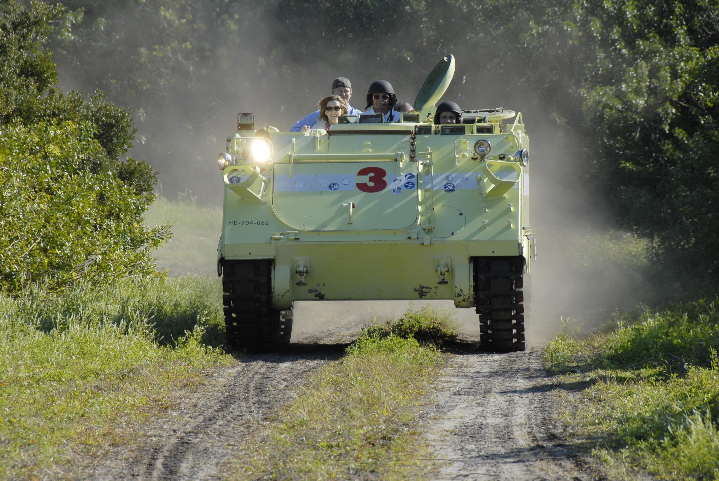 KENNEDY SPACE CENTER, FLA. -- At Launch Complex 39, members of the STS-117 crew are instructed in the operation of an M-113 armored personnel carrier by the astronaut rescue team. The astronauts on the STS-117 crew are participating in M-113 armored personnel carrier training during Terminal Countdown Demonstration Test (TCDT) activities, a dress rehearsal for their launch, targeted for March 15. The M-113 could be used to move the crew away from the launch pad quickly in the event of an emergency. The TCDT also includes pad emergency egress training and a simulated launch countdown. The mission payload aboard Space Shuttle Atlantis is the S3/S4 integrated truss structure, along with a third set of solar arrays and batteries. The crew of six astronauts will install the truss to continue assembly of the station. Photo credit: NASA/Kim Shiflett