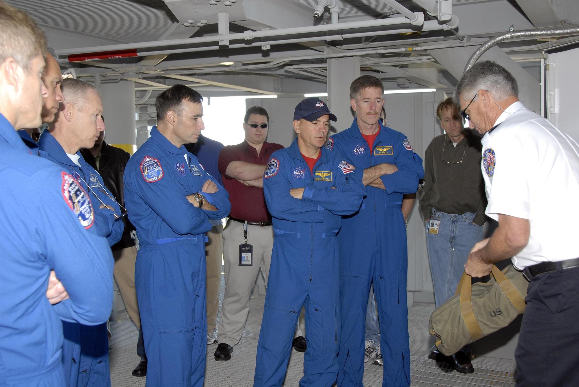 KENNEDY SPACE CENTER, FLA. -- During Terminal Countdown Demonstration Test activities, the Mission STS-117 crew members receive instruction on emergency egress during a walkdown of the 195-foot level of the fixed service structure at Launch Pad 39A. From the left are Mission Specialists Steven Swanson, Danny Olivas and Patrick Forrester, Pilot Lee Archambault, Commander Rick Sturckow and Mission Specialist James Reilly. The TCDT also includes M-113 armored personnel carrier training, and a simulated launch countdown. The mission payload aboard Space Shuttle Atlantis is the S3/S4 integrated truss structure, along with a third set of solar arrays and batteries. The crew of six astronauts will install the truss to continue assembly of the International Space Station. Photo credit: NASA/Kim Shiflett
