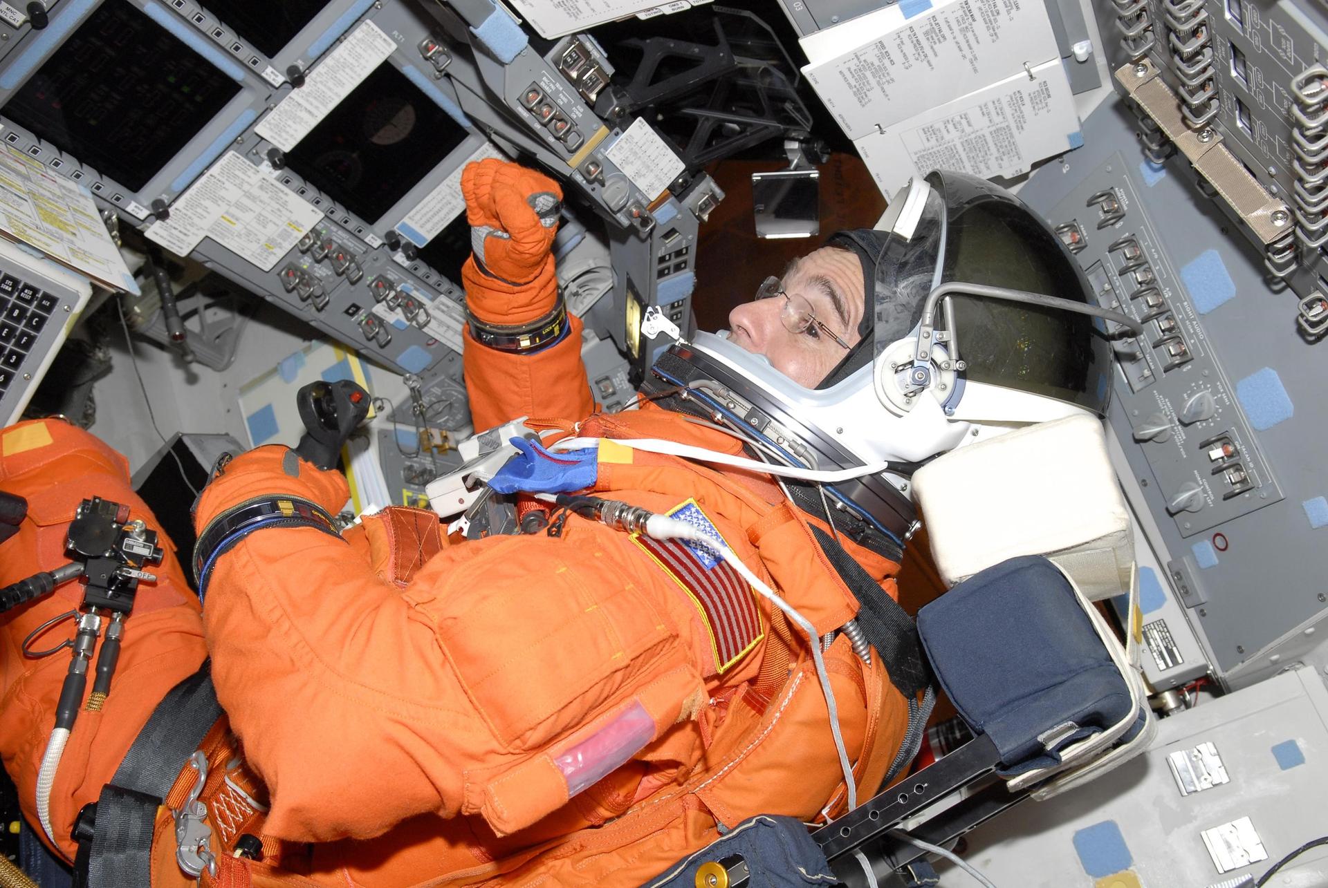 KENNEDY SPACE CENTER, FLA. -- Mission STS-117 Pilot Lee Archambault sits in the cockpit of Space Shuttle Atlantis at Launch Pad 39A to participate in a simulated launch countdown that is part of the prelaunch preparations known as terminal countdown demonstration test (TCDT). The TCDT also includes M-113 armored personnel carrier training and payload familiarization. The STS-117 mission is No. 21 to the International Space Station. Mission payloads aboard Atlantis include the S3/S4 integrated truss structure, a third set of solar arrays and batteries. The crew of six astronauts will install the truss to continue assembly of the station. Launch is scheduled for no earlier than March 15. Photo credit: NASA/Kim Shiflett.