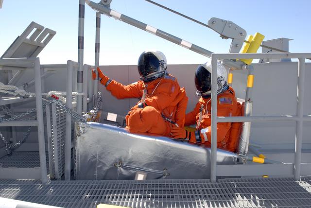 KENNEDY SPACE CENTER, FLA. -- From the 195-foot level of the fixed service structure on Launch Pad 39A, STS-117 Mission Specialists Danny Olivas (front) and James Reilly sit in a slidewire basket, part of the emergency egress system. They and other crew members are practicing the emergency egress procedure to get off the pad, part of the prelaunch preparations known as terminal countdown demonstration test (TCDT). The TCDT also includes M-113 armored personnel carrier training and payload familiarization. The STS-117 mission is No. 21 to the International Space Station. Mission payloads aboard Atlantis include the S3/S4 integrated truss structure, a third set of solar arrays and batteries. The crew of six astronauts will install the truss to continue assembly of the station. Launch is scheduled for no earlier than March 15. Photo credit: NASA/Kim Shiflett.