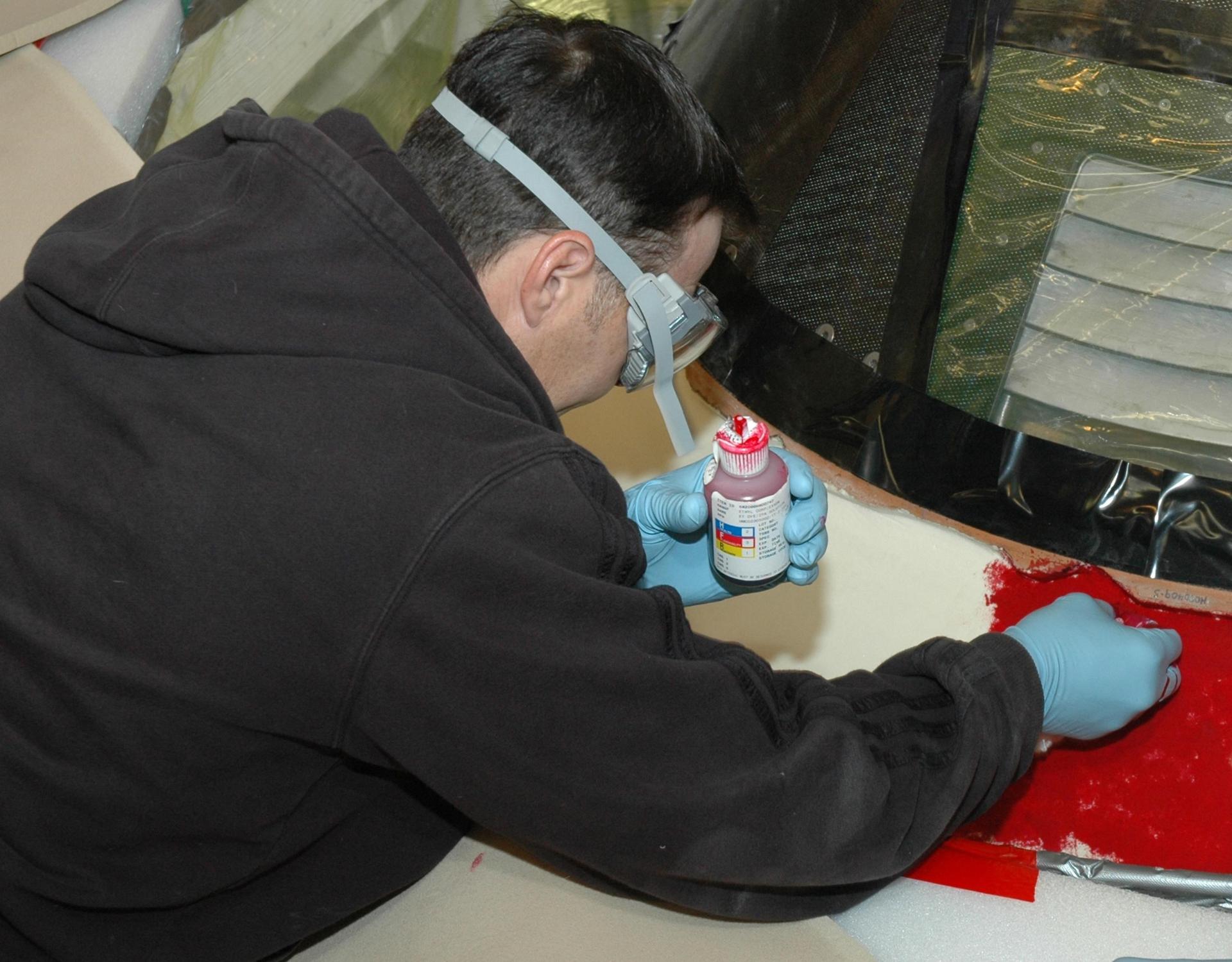 KENNEDY SPACE CENTER, FLA. -- In Highbay 1 inside the Vehicle Assembly Building, a technician carefully applies red dye to the external tank as part of repair operations. A severe thunderstorm with golf ball-sized hail caused visible divots in the giant tank's foam insulation and minor surface damage to about 26 heat shield tiles on the shuttle's left wing. A new target launch date has not been determined, but teams will focus on preparing Atlantis for liftoff in late April on mission STS-117. Photo credit: NASA/Jim Grossmann
