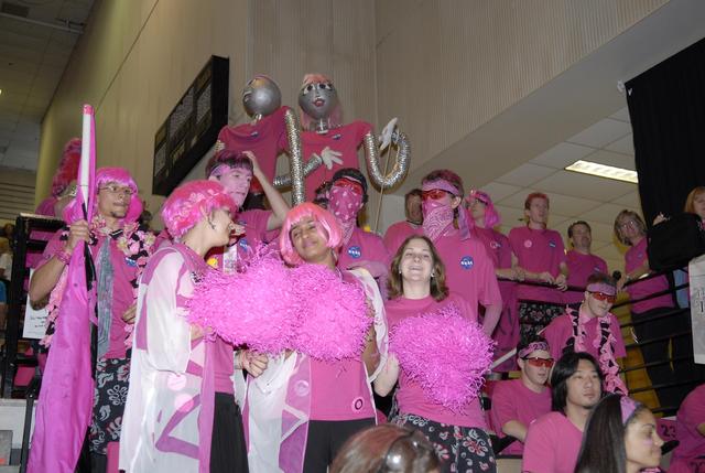 KENNEDY SPACE CENTER, FLA. -- The student team dressed in pink is a coordinated effort cosponsored by NASA KSC and representing Rockledge, Cocoa Beach and Viera High Schools in Central Florida. The FIRST, or For Inspiration and Recognition of Science and Technology, Robotics Competition challenges teams of young people and their mentors to solve a common problem in a six-week timeframe using a standard "kit of parts" and a common set of rules. Teams build robots from the parts and enter them in a series of competitions designed by FIRST founder Dean Kamen and Dr. Woodie Flowers, chairman and vice chairman of the Executive Advisory Board respectively, and a committee of engineers and other professionals. FIRST redefines winning for these students. Teams are rewarded for excellence in design, demonstrated team spirit, gracious professionalism and maturity, and ability to overcome obstacles. Scoring the most points is a secondary goal. Winning means building partnerships that last. Photo credit: NASA/Kim Shiflett