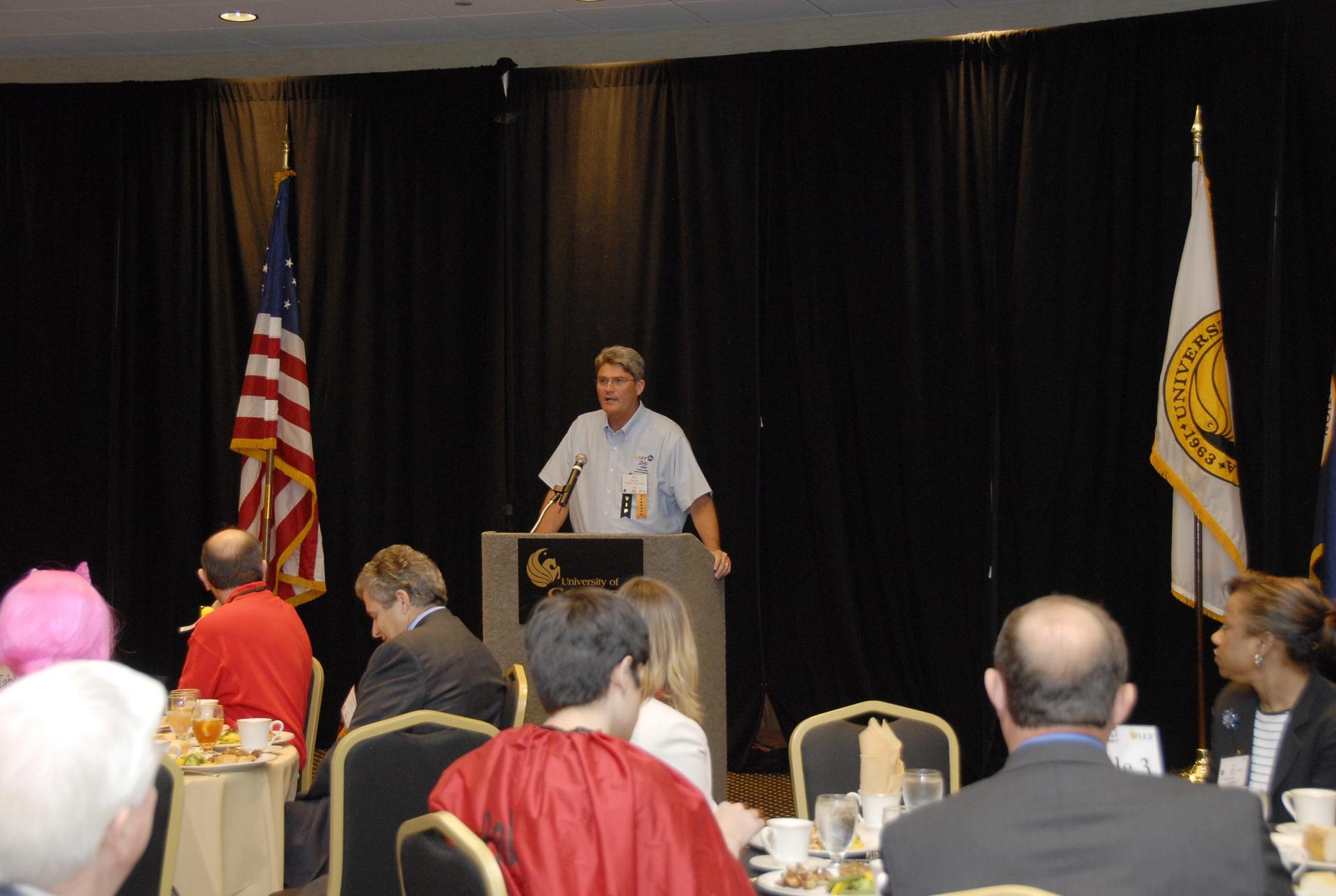 KENNEDY SPACE CENTER, FLA. -- Center Director Bill Parsons talks to guests at the VIP luncheon held during the FIRST robotics event held at the University of Central Florida Arena March 8-10. This was Parsons' first year attending the event as center director. An alumnus of UCF, Parsons also serves on the FIRST Executive Advisory Board. The FIRST, or For Inspiration and Recognition of Science and Technology, Robotics Competition challenges teams of young people and their mentors to solve a common problem in a six-week timeframe using a standard "kit of parts" and a common set of rules. Teams build robots from the parts and enter them in a series of competitions designed by FIRST founder Dean Kamen and Dr. Woodie Flowers, chairman and vice chairman of the Executive Advisory Board respectively, and a committee of engineers and other professionals. FIRST redefines winning for these students. Teams are rewarded for excellence in design, demonstrated team spirit, gracious professionalism and maturity, and ability to overcome obstacles. Scoring the most points is a secondary goal. Winning means building partnerships that last. Photo credit: NASA/Kim Shiflett