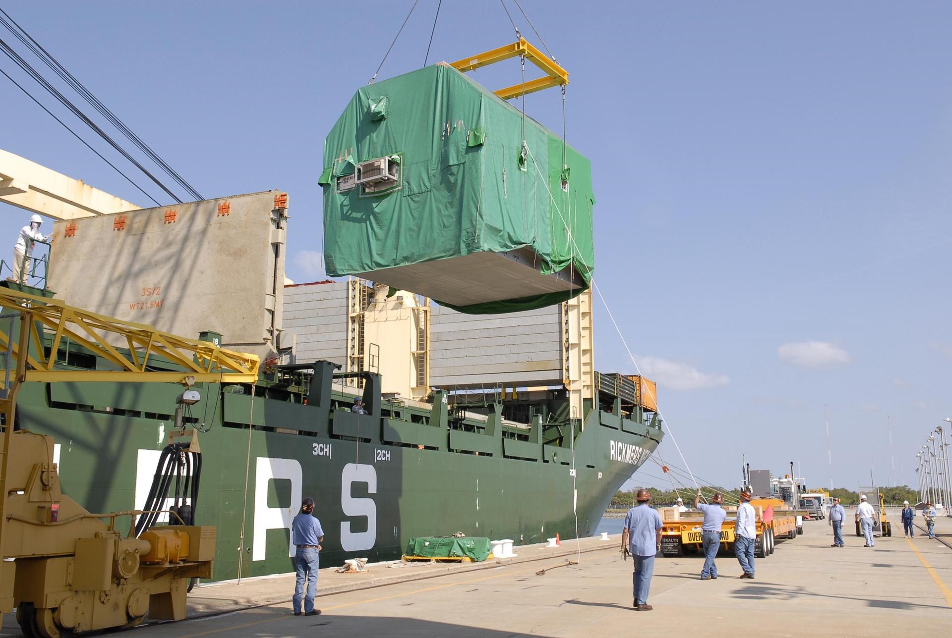 KENNEDY SPACE CENTER, FLA. -- At the Trident wharf, workers help guide the container with the Experiment Logistics Module Pressurized Section inside toward the dock. The logistics module is part of the Japanese Experiment Module. The logistics module will be transported to the Space Station Processing Facility at NASA's Kennedy Space Center. The Japanese Experiment Module is composed of three segments and is known as Kibo, which means "hope" in Japanese. Kibo consists of six components: two research facilities -- the Pressurized Module and Exposed Facility; a Logistics Module attached to each of them; a Remote Manipulator System; and an Inter-Orbit Communication System unit. Kibo also has a scientific airlock through which experiments are transferred and exposed to the external environment of space. Kibo is Japan's first human space facility and its primary contribution to the station. Kibo will enhance the unique research capabilities of the orbiting complex by providing an additional environment in which astronauts can conduct science experiments. The various components of JEM will be assembled in space over the course of three Space Shuttle missions. The first of those three missions, STS-123, will carry the Experiment Logistics Module Pressurized Section aboard the Space Shuttle Endeavour, targeted for launch in 2007. Photo credit: NASA/Kim Shiflett
