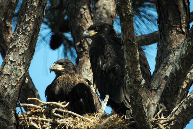 KENNEDY SPACE CENTER, FLA. -- Two fledgling eagles bear the regal look of their parents as they rest in their nest at the north end of S.R. 3 near Kennedy Space Center. This year-old nest is one of a dozen eagle nests both in KSC and in the Merritt Island National Wildlife Refuge, which surrounds KSC. The refuge includes several wading bird rookeries, many osprey nests, up to 400 manatees during the spring, and approximately 2,500 Florida scrub jays. It also is a major wintering area for migratory birds. More than 500 species of wildlife inhabit the refuge, with 15 considered federally threatened or endangered. Photo credit: NASA/Ken Thornsley