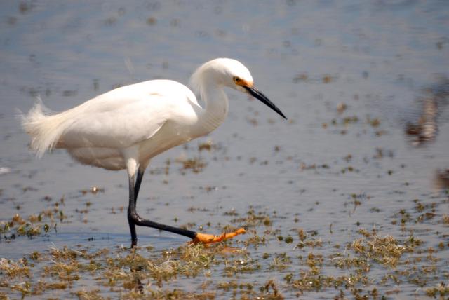 KENNEDY SPACE CENTER, FLA. -- A snowy egret marches through a pond near Kennedy Space Center, looking for food. The snowy egret can be identified by its slender black bill, black legs and yellow feet. This species inhabits salt marshes, ponds, rice field and shallow coastal bays along the coast from Maine to southern South America. They are also found in northern California, Texas and Oklahoma. KSC shares a boundary with the Merritt Island National Wildlife Refuge, which surrounds it. The refuge is a habitat for more than 310 species of birds, 25 mammals, 117 fishes and 65 amphibians and reptiles. In addition, the refuge supports 19 endangered or threatened wildlife species on Federal or State lists, more than any other single refuge in the U.S. Photo credit: NASA/Ken Thornsley