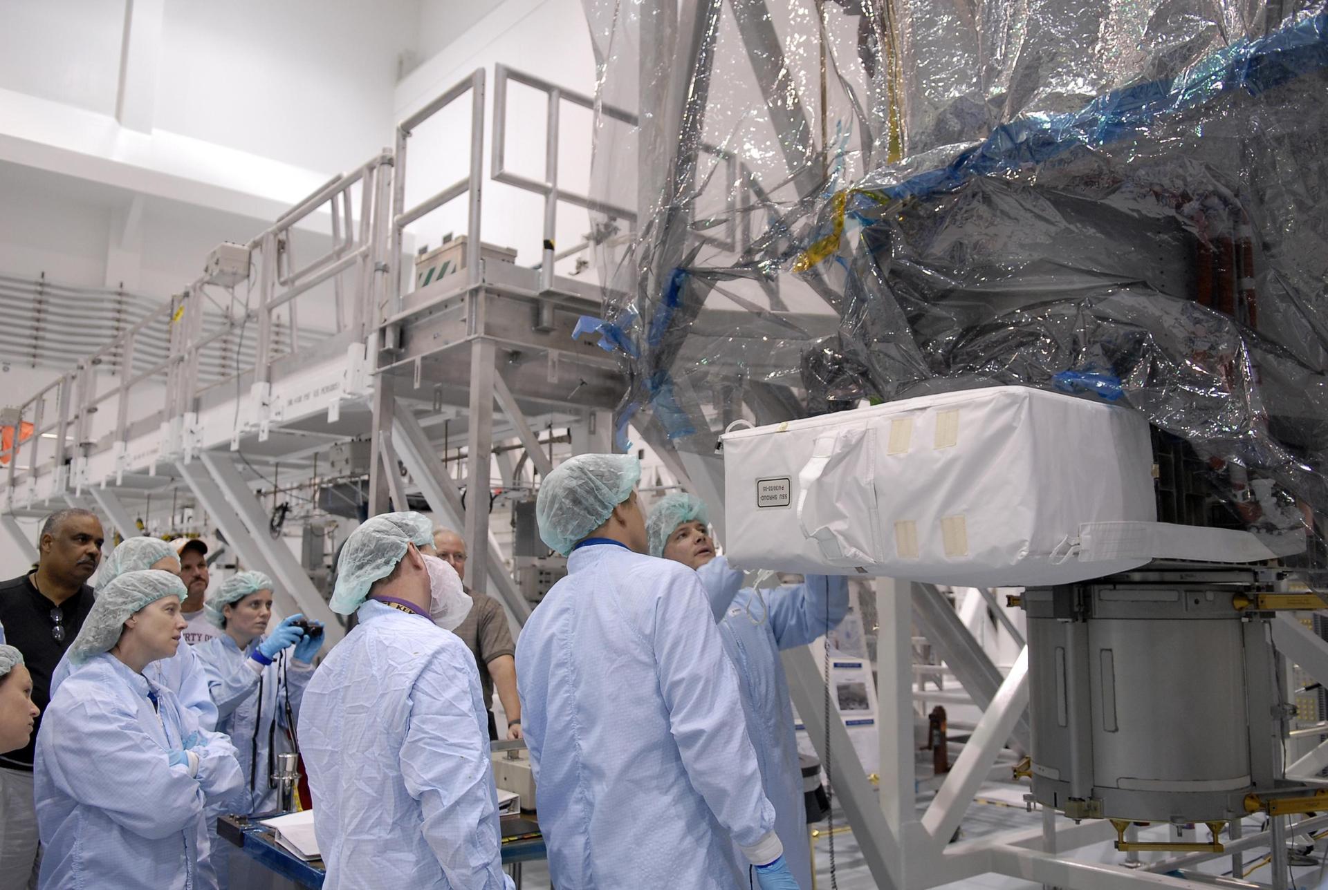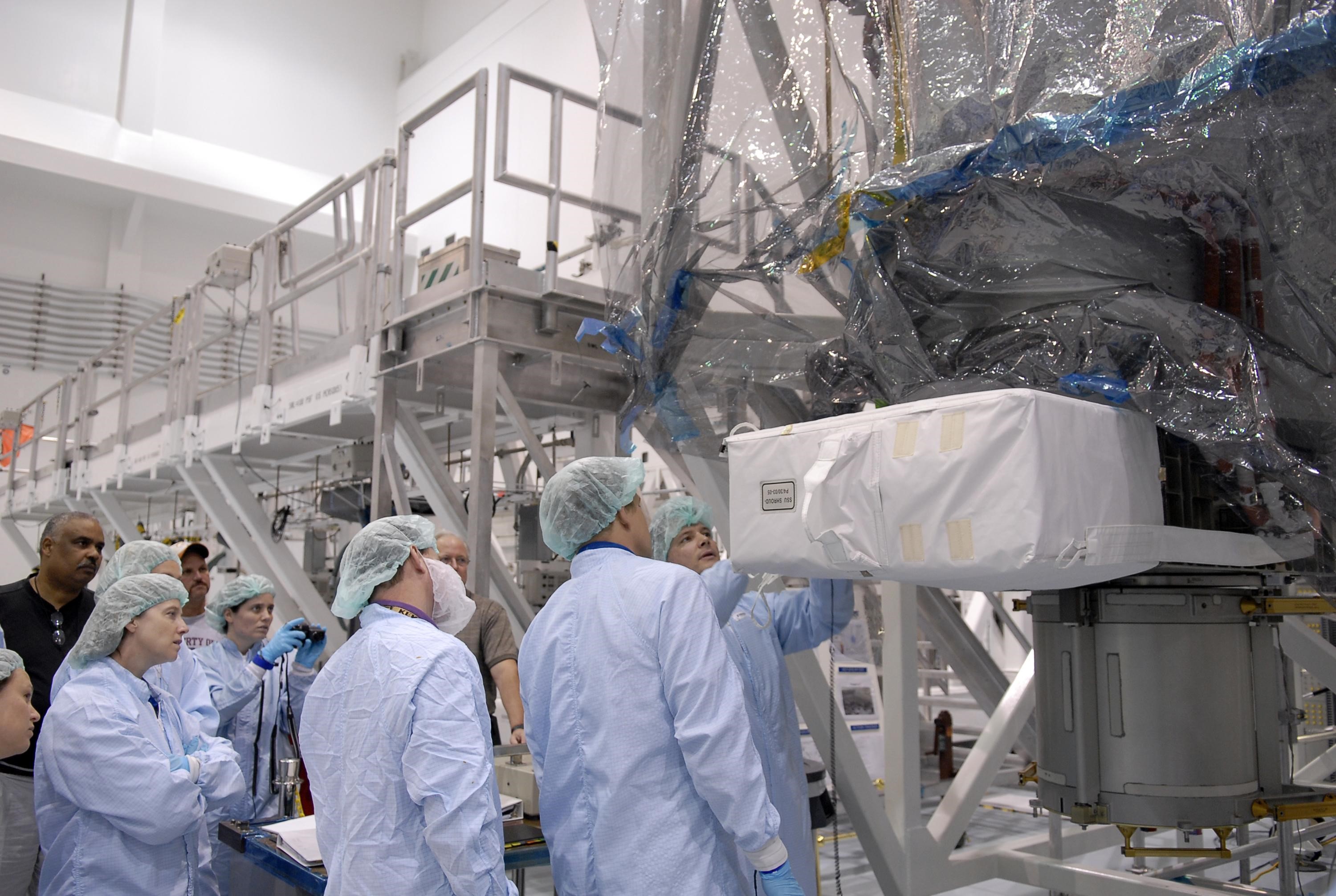 KENNEDY SPACE CENTER, FLA. -- Inside the Space Station Processing Facility, mission STS-120 crew members familiarize themselves with equipment during a visit to Kennedy Space Center. Crew members are Commander Pam Melroy, Pilot George Zamka and Mission Specialists Scott Parazynski, Douglas Wheelock, Stephanie Wilson, Paolo Nespoli (with the European Space Agency), Daniel Tani and Clayton Anderson. Mission STS-120 will deliver the Node 2 "Harmony" connecting module to the station. During the mission, Tani and Anderson will transfer to the station and remain as flight engineers for Expedition 15. The mission is tentatively scheduled for August of this year. Photo credit: NASA/Kim Shiflett