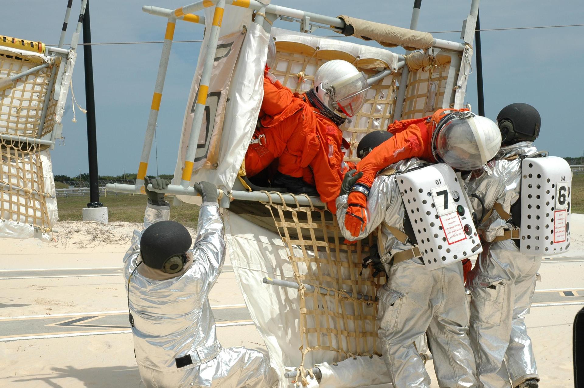 KENNEDY SPACE CENTER, FLA. -- During the second stage of a simulated emergency, known as Mode 4, KSC rescue team members help "injured" astronauts, portrayed by KSC personnel, out of the slidewire baskets. The emergency exercise began at the 195-foot level of Launch Pad 39A. The KSC rescue teams are practicing emergency procedures in the unlikely scenario of a mishap on the pad during a launch sequence. The exercises are standard training procedures to assess and prepare emergency personnel, procedures and hardware. Photo credit: NASA/Jim Grossmann