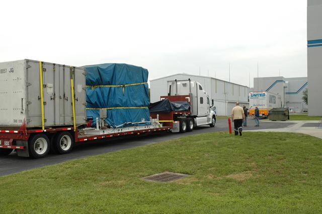 KENNEDY SPACE CENTER, FLA. -- Two trucks (one air-ride, one flat-bed) deliver the Dawn spacecraft, as well as additional electrical and ground support equipment and xenon ground support equipment, to Astrotech. Dawn will be moved from the truck and the shipping container removed. The spacecraft will then be moved into the high bay of the Payload Processing Facility. Dawn's mission is to explore two of the asteroid belt's most intriguing and dissimilar occupants: asteroid Vesta and the dwarf planet Ceres. The Dawn mission is managed by JPL, a division of the California Institute of Technology in Pasadena, for NASA's Science Mission Directorate in Washington, D.C. Photo credit: NASA/Jim Grossmann