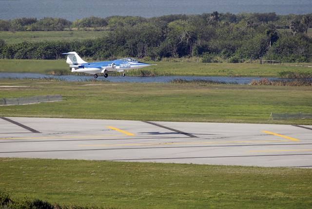 KENNEDY SPACE CENTER, FLA. -- The Starfighter F-104 approaches the runway at the KSC Shuttle Landing Facility for a landing after its test flight. The aircraft is taking part in a series of pathfinder test missions from the space shuttle runway. Two flights will generate test data to validate sonic boom assumptions about the potential impacts of suborbital and orbital commercial spaceflight from the facility. NASA is assessing the environmental impact of such flights. Starfighters Inc. of Clearwater, Fla., will perform the flights to help in assessing suborbital space launch trajectories from the runway and paving the way for future commercial space tourism and research flights from the facility. Photo credit: NASA/Kim Shiflett