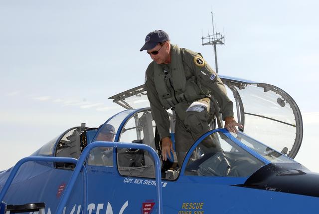 KENNEDY SPACE CENTER, FLA. -- After returning from a test flight, pilot Rick Svetkoff climbs out of the cockpit of the Starfighter F-104. The aircraft is taking part in a series of pathfinder test missions from the space shuttle runway. Two flights will generate test data to validate sonic boom assumptions about the potential impacts of suborbital and orbital commercial spaceflight from the facility. NASA is assessing the environmental impact of such flights. Starfighters Inc. of Clearwater, Fla., will perform the flights to help in assessing suborbital space launch trajectories from the runway and paving the way for future commercial space tourism and research flights from the facility. Photo credit: NASA/Kim Shiflett