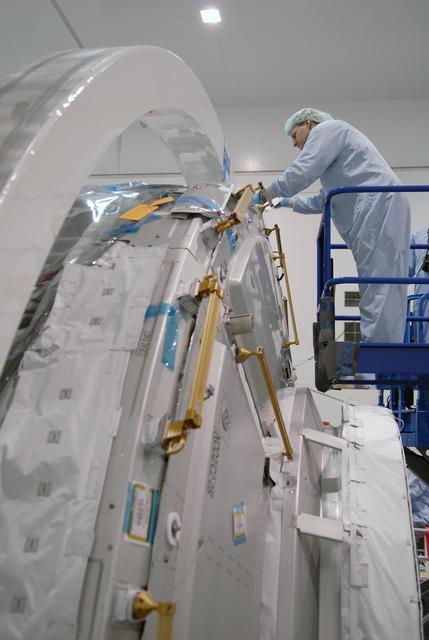 KENNEDY SPACE CENTER, FLA. -- In the Space Station Processing Facility, STS-120 Mission Specialist Scott Parazynski becomes familiar with the Node 2, another element to be added to the International Space Station. He and other crew members are at KSC for equipment familiarization. Node 2 will provide a passageway between three station science experiment facilities: the U.S. Destiny Laboratory, the Kibo Japanese Experiment Module, and the European Columbus Laboratory. STS-120 is targeted for launch on October 20. Photo credit: NASA/Kim Shiflett