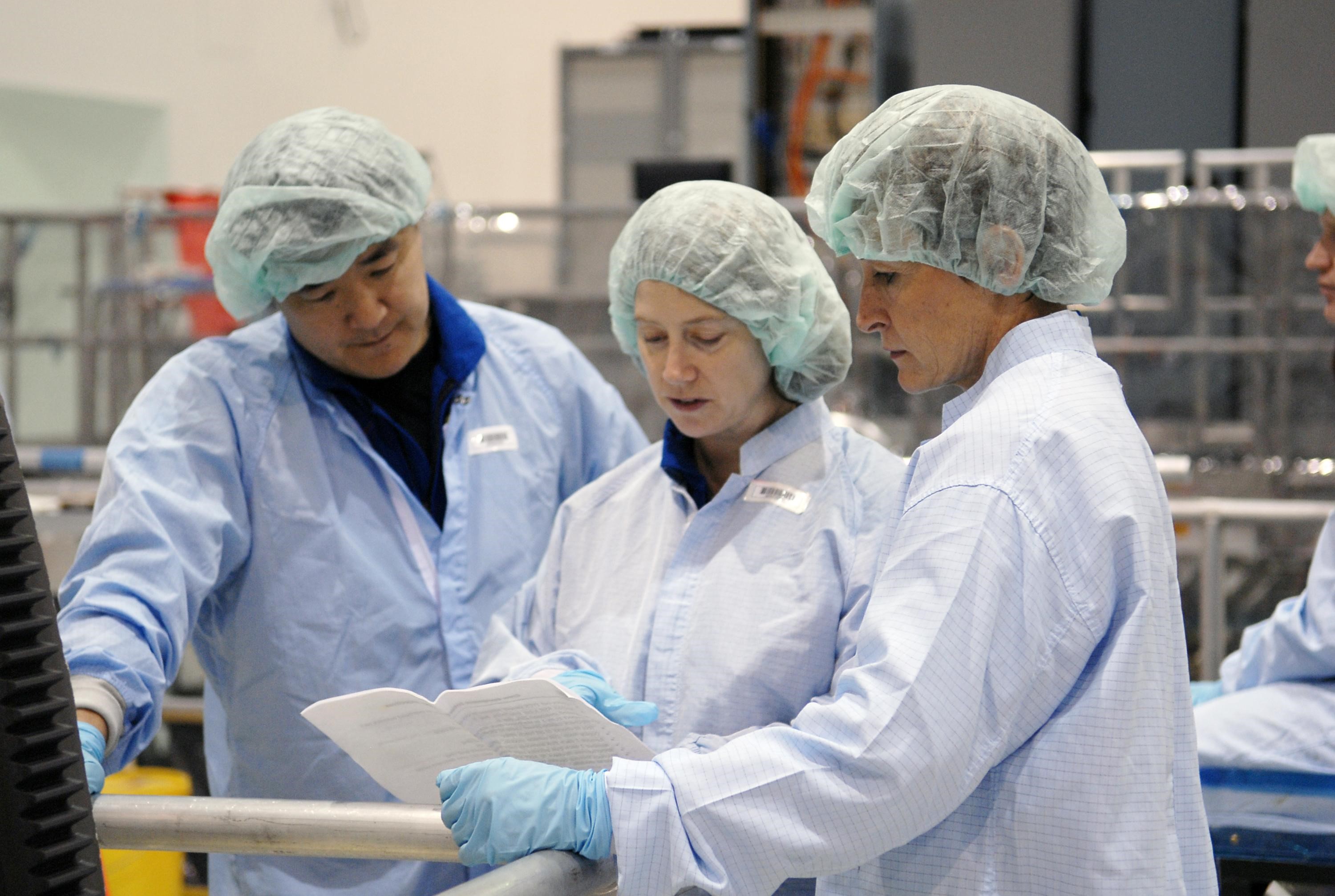 KENNEDY SPACE CENTER, FLA. -- In the Space Station Processing Facility, STS-120 Mission Specialist Daniel Tani (left) and Commander Pamela Melroy learn some details about the Node 2, another element to be added to the International Space Station. With them, at right, is astronaut Peggy Whitson, who served on Expedition 5 aboard the space station. During her 6-month stay aboard the space station, Dr. Whitson installed the Mobile Base System, the S1 truss segment, and the P1 truss segment. Tani, Melroy and other crew members are at KSC for equipment familiarization. Tani will be joining the Expedition 15 crew on the space station as flight engineer. Node 2 will provide a passageway between three station science experiment facilities: the U.S. Destiny Laboratory, the Kibo Japanese Experiment Module, and the European Columbus Laboratory. STS-120 is targeted for launch on October 20. Photo credit: NASA/Kim Shiflett