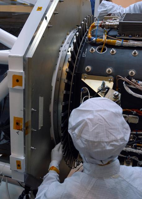 KENNEDY SPACE CENTER, FLA. -- At Vandenberg Air Force Base in California, a technician mates the AIM spacecraft, at left, to the Orbital Sciences Pegasus XL rocket, at right. AIM, which stands for Aeronomy of Ice in the Mesosphere, is being prepared for integrated testing and a flight simulation. The AIM spacecraft will fly three instruments designed to study polar mesospheric clouds located at the edge of space, 50 miles above the Earth's surface in the coldest part of the planet's atmosphere. The mission's primary goal is to explain why these clouds form and what has caused them to become brighter and more numerous and appear at lower latitudes in recent years. AIM's results will provide the basis for the study of long-term variability in the mesospheric climate and its relationship to global climate change. Launch from the Pegasus XL rocket is scheduled for April 25.