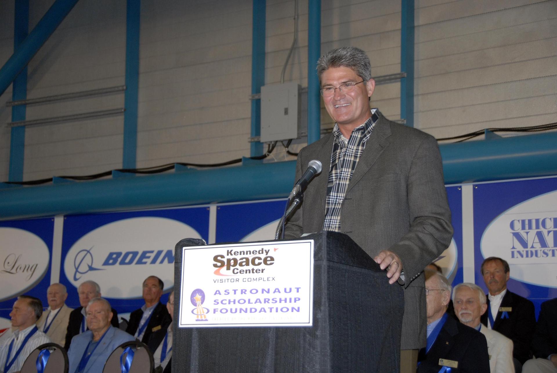 KENNEDY SPACE CENTER, FLA. -- At the U.S. Astronaut Hall of Fame induction ceremony, Kennedy Space Center Director Bill Parsons speaks about the accomplishments of the newest inductees to the Hall of Fame. The May 5 induction added space shuttle commanders Michael L. Coats, Steven A. Hawley and Jeffrey A. Hoffman to the Hall of Fame. They grow the number of space explorers enshrined in the Hall of Fame to 66. These gentlemen have joined such American space heroes as Neil Armstrong, Glenn, Alan Shepard and Sally Ride. The ceremony was held at the Kennedy Space Center's Apollo/Saturn V Center. Photo credit: NASA/Kim Shiflett