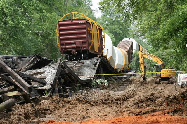 KENNEDY SPACE CENTER, FLA. -- A train carrying space shuttle reusable solid rocket motor segments from the ATK Launch Systems manufacturing site in Brigham City,Utah, to NASA’s Kennedy Space Center in Florida was derailed May 2. At the site of the train mishap involving eight NASA solid rocket booster segment cars, a handling fixture has been attached to a box car being used as a spacer between the segment cars so that it can be removed from the rails. The solid rocket booster cars can be seen behind it. The train was traveling over the Meridian & Bigbee railroad near Pennington, Ala., at the time of the mishap.. The hardware was intended for use on shuttle Discovery's STS-120 mission in October and shuttle Atlantis's STS-122 mission in December. These segments are interchangeable, and ATK Launch Systems has replacement units that could be used for the shuttle flights, if necessary.
