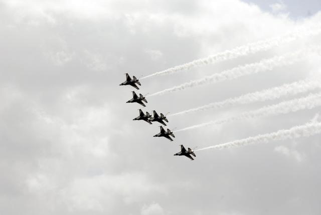 KENNEDY SPACE CENTER, FLA. -- U.S. Air Force Thunderbird F-16 jets fly in formation above the Industrial Area of Kennedy Space Center. The purpose of the flyover was to photograph the area for promotional purposes. Kennedy Space Center Visitor Complex will host the inaugural World Space Expo from Nov. 3 to 11, featuring an aerial salute by the Thunderbirds on its opening weekend. The Expo will create one of the largest displays of space artifacts, hardware and personalities ever assembled in one location with the objective to inspire, educate and engage the public by highlighting the achievements and benefits of space exploration. Photo credit: NASA/Kim Shiflett