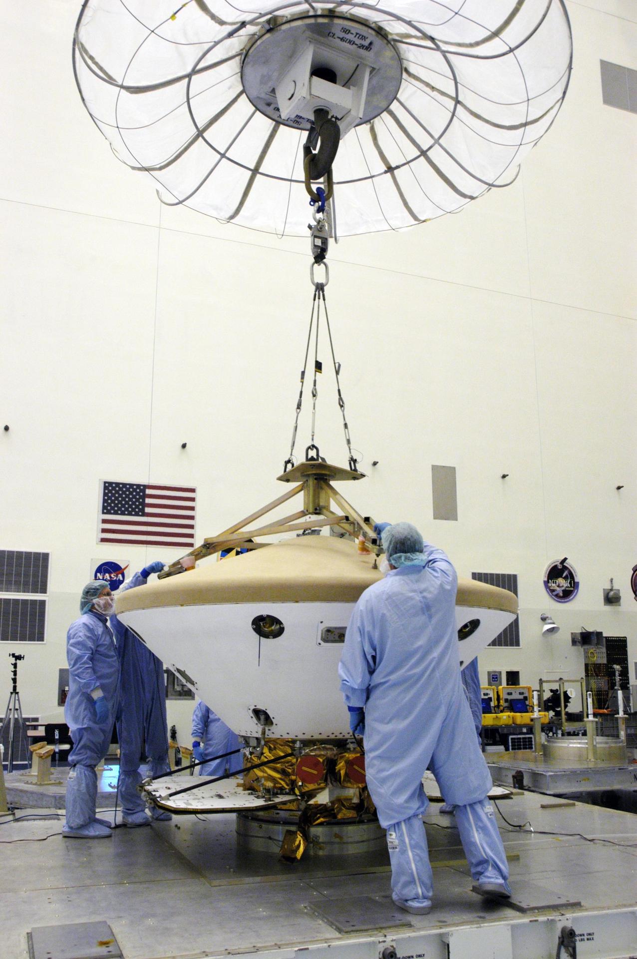 KENNEDY SPACE CENTER, FLA. -- In the Payload Hazardous Servicing Facility, technicians attach a crane to the Phoenix Mars Lander spacecraft. The crane will be used to remove the heat shield from around the Phoenix. The Phoenix mission is the first project in NASA's first openly competed program of Mars Scout missions. Phoenix will land in icy soils near the north polar permanent ice cap of Mars and explore the history of the water in these soils and any associated rocks, while monitoring polar climate. Landing is planned in May 2008 on arctic ground where a mission currently in orbit, Mars Odyssey, has detected high concentrations of ice just beneath the top layer of soil. It will serve as NASA's first exploration of a potential modern habitat on Mars and open the door to a renewed search for carbon-bearing compounds, last attempted with NASA’s Viking missions in the 1970s. A stereo color camera and a weather station will study the surrounding environment while the other instruments check excavated soil samples for water, organic chemicals and conditions that could indicate whether the site was ever hospitable to life. Microscopes can reveal features as small as one one-thousandth the width of a human hair. Launch of Phoenix aboard a Delta II rocket is targeted for Aug. 3 from Cape Canaveral Air Force Station in Florida. Photo credit: NASA/George Shelton