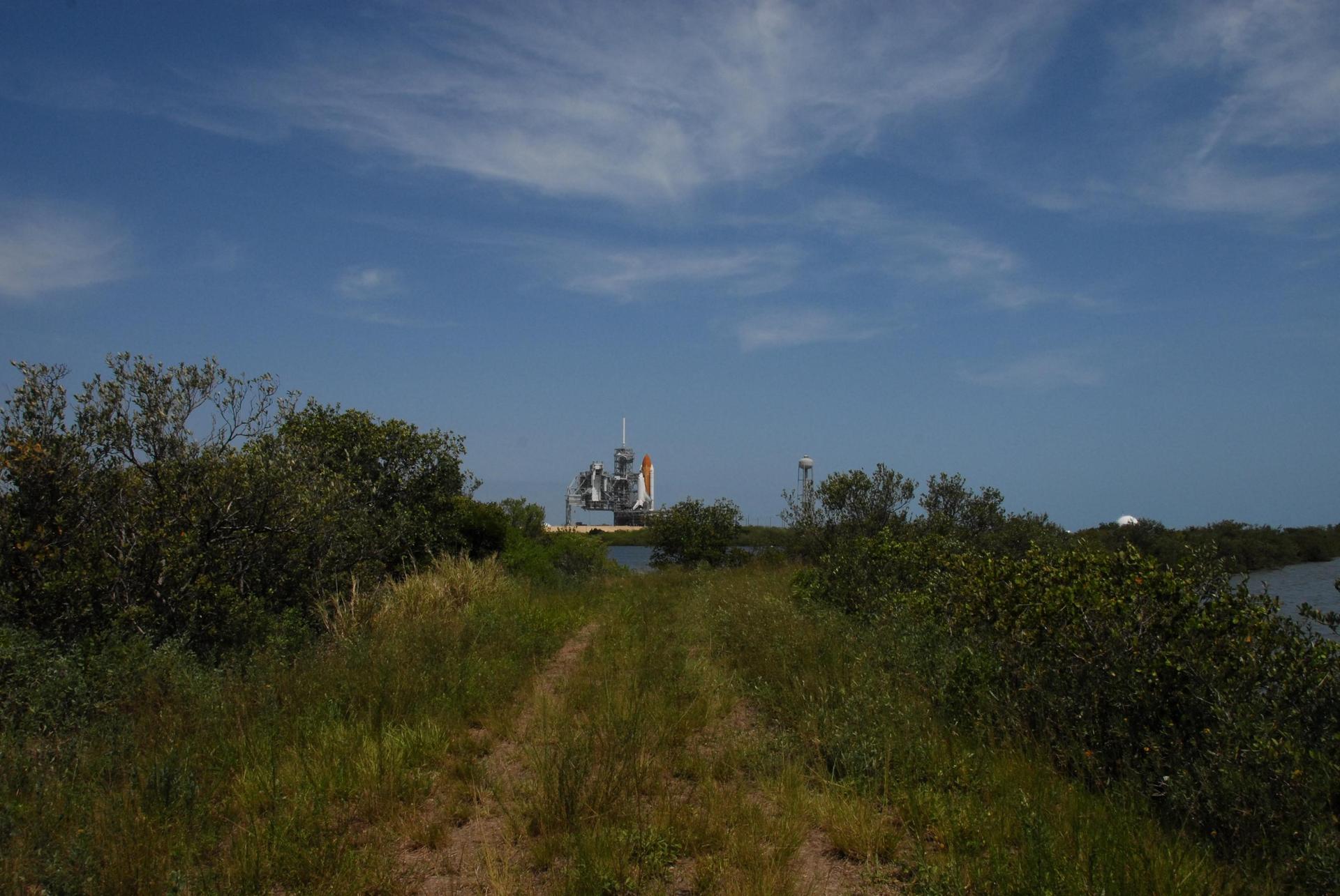 KENNEDY SPACE CENTER, FLA. -- From a vantage point across scrub lands and the Banana River, Space Shuttle Atlantis is seen finally sitting on Launch Pad 39A. Atlantis rolled out to the pad for the second time before dawn. First motion out of the Vehicle Assembly Building was at 5:02 a.m. EDT. In late February, while Atlantis was on the launch pad, Atlantis' external tank received hail damage during a severe thunderstorm that passed through the Kennedy Space Center Launch Complex 39 area. The hail caused visible divots in the giant tank's foam insulation, as well as minor surface damage to about 26 heat shield tiles on the shuttle's left wing. The shuttle was returned to the VAB for repairs. The launch of Space Shuttle Atlantis on mission STS-117 is now targeted for June 8. A flight readiness review will be held on May 30 and 31. Photo credit: NASA/Ken Thornsley