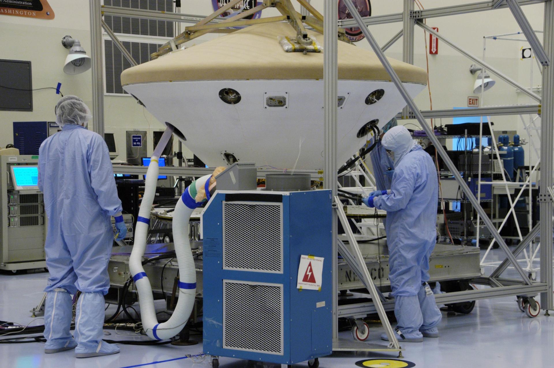 KENNEDY SPACE CENTER, FLA. -- In the Payload Hazardous Servicing Facility, workers monitor the Phoenix spacecraft during a heat shield deployment test, with a firing of ordnance associated with the separation device. Phoenix will land in icy soils near the north polar permanent ice cap of Mars and explore the history of the water in these soils and any associated rocks, while monitoring polar climate. Landing is planned in May 2008 on arctic ground where a mission currently in orbit, Mars Odyssey, has detected high concentrations of ice just beneath the top layer of soil. Launch of Phoenix aboard a Delta II rocket is targeted for Aug. 3 from Cape Canaveral Air Force Station in Florida. Photo credit: NASA/George Shelton
