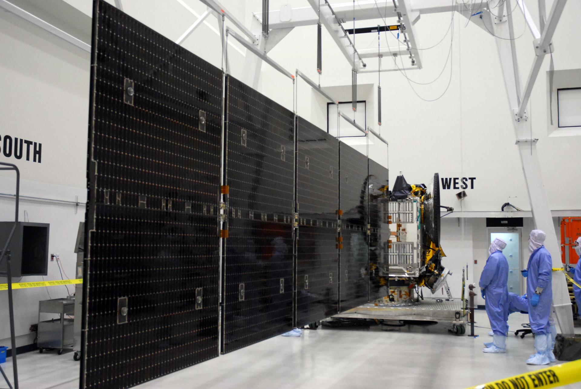 KENNEDY SPACE CENTER, FLA. -- At Astrotech, the more than 32-foot-long solar panels on one side of the Dawn spacecraft are fully deployed during a test. Dawn's mission is to explore two of the asteroid belt's most intriguing and dissimilar occupants: asteroid Vesta and the dwarf planet Ceres. Dawn is scheduled to launch June 30 aboard a Delta II rocket from Launch Complex 17-B at Cape Canaveral Air Force Station. Photo credit: NASA/George Shelton