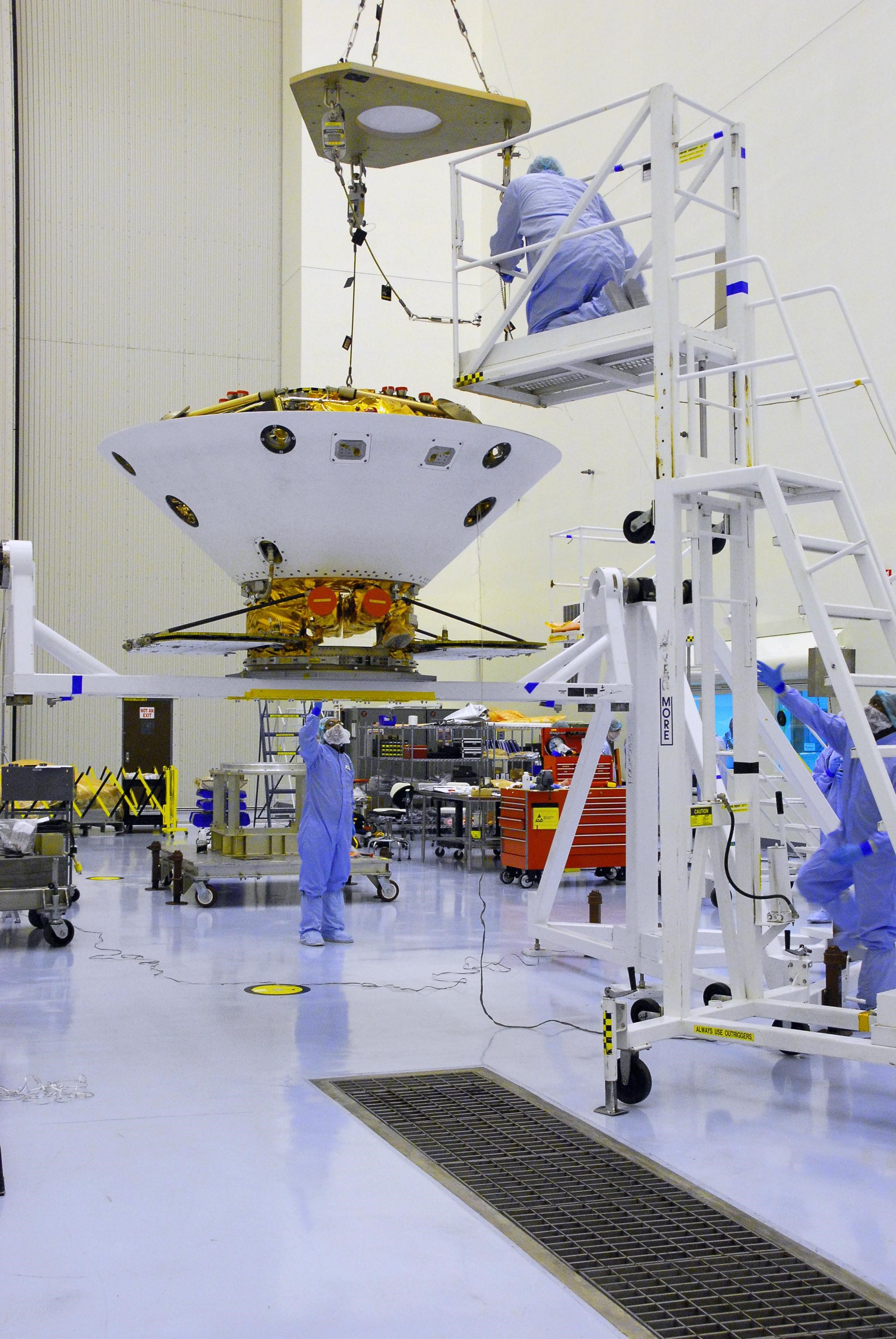 KENNEDY SPACE CENTER, FLA. -- In the Payload Handling Servicing Facility, an overhead crane lowers the Phoenix spacecraft onto a rotation stand for an interim weight and center of gravity determination. The Phoenix mission is the first project in NASA's first openly competed program of Mars Scout missions. Phoenix will land in icy soils near the north polar permanent ice cap of Mars and explore the history of the water in these soils and any associated rocks, while monitoring polar climate. Landing is planned in May 2008 on arctic ground where a mission currently in orbit, Mars Odyssey, has detected high concentrations of ice just beneath the top layer of soil. It will serve as NASA's first exploration of a potential modern habitat on Mars and open the door to a renewed search for carbon-bearing compounds, Photo credit: NASA/George Shelton