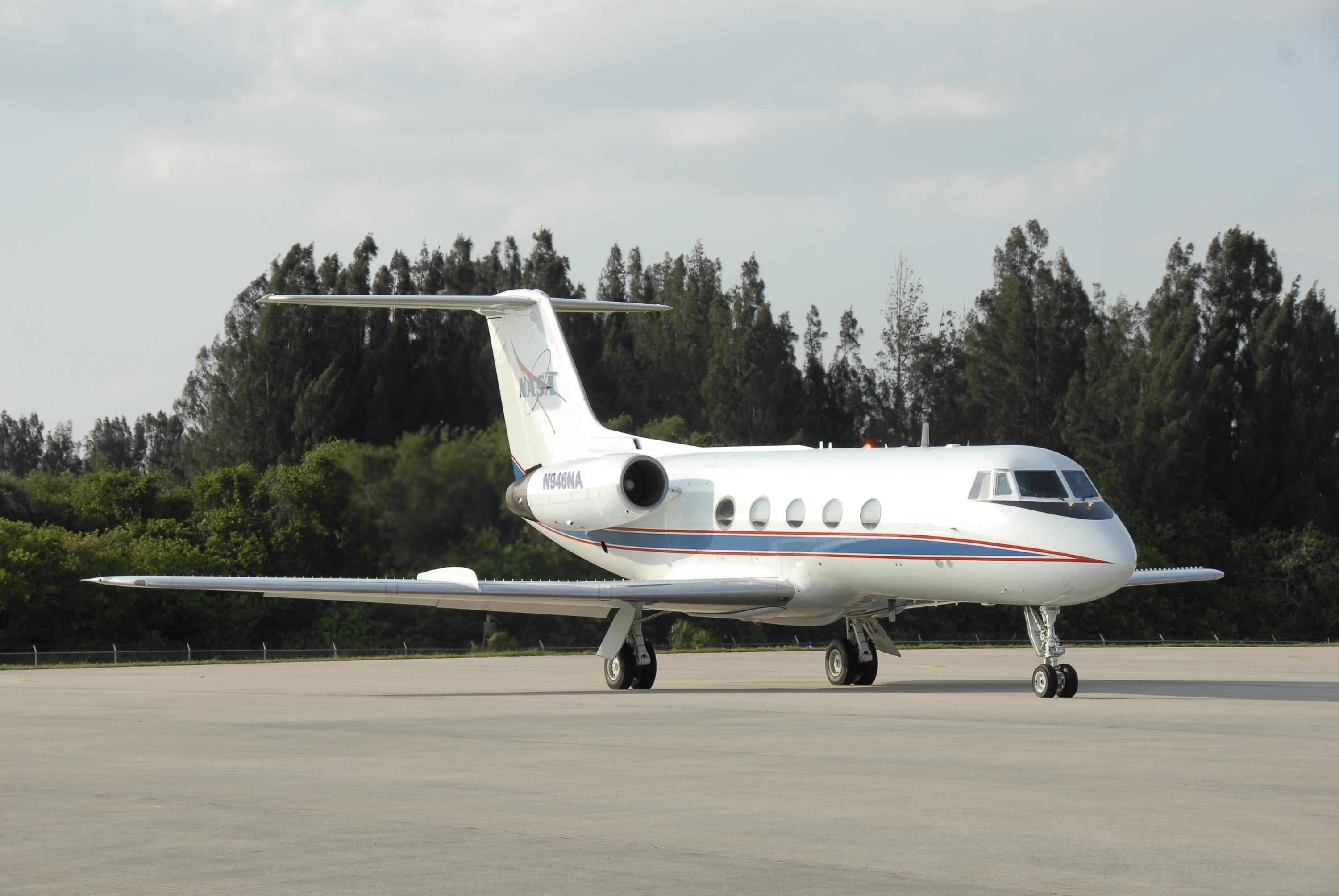 KENNEDY SPACE CENTER, FLA. -- The shuttle training aircraft, or STA, with STS-117 Commander Frederick Sturckow and Pilot Lee Archambault in the cockpit begins to taxi to the runway at KSC's Shuttle Landing Facility. Sturckow and Archambault will be making practice landings in the STA, which is a Grumman American Aviation-built Gulf Stream II jet that was modified to simulate an orbiter's cockpit, motion and visual cues, and handling qualities. In flight, the STA duplicates the orbiter's atmospheric descent trajectory from approximately 35,000 feet altitude to landing on a runway. STS-117 is scheduled to launch at 7:38 p.m. June 8. During the 11-day mission and three spacewalks, the crew will work with flight controllers at NASA's Johnson Space Center in Houston to install the 17-ton segment on the station's girder-like truss and deploy the set of solar arrays, S3/S4. The mission will increase the space station's power capability in preparation for the arrival of new science modules from the European and Japanese space agencies. Photo credit: NASA/Kim Shiflett