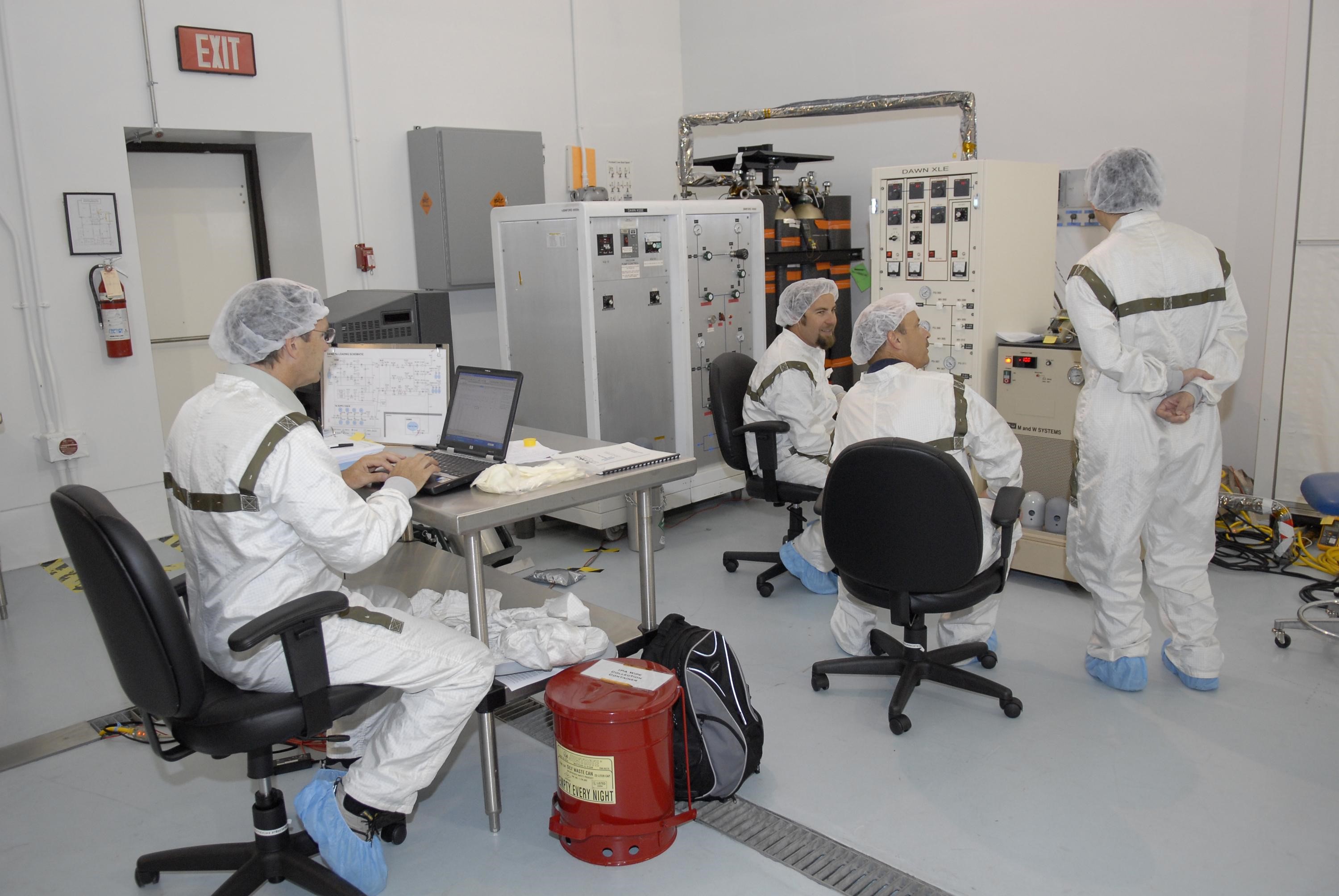 KENNEDY SPACE CENTER, FLA. -- In Astrotech's Hazardous Processing Facility, technicians check data during the loading of xenon for the ion propulsion system in the Dawn spacecraft. Dawn's mission is to explore two of the asteroid belt's most intriguing and dissimilar occupants: asteroid Vesta and the dwarf planet Ceres. The Dawn spacecraft uses ion propulsion to get the additional velocity needed to reach Vesta once it leaves the Delta rocket. It also uses ion propulsion to spiral to lower altitudes on Vesta, to leave Vesta and cruise to Ceres and to spiral to a low-altitude orbit at Ceres. Ion propulsion makes efficient use of the onboard fuel by accelerating it to a velocity 10 times that of chemical rockets. Dawn is scheduled to launch July 7aboard a Delta II rocket from Launch Complex 17-B at Cape Canaveral Air Force Station. Photo credit: NASA/Kim Shiflett