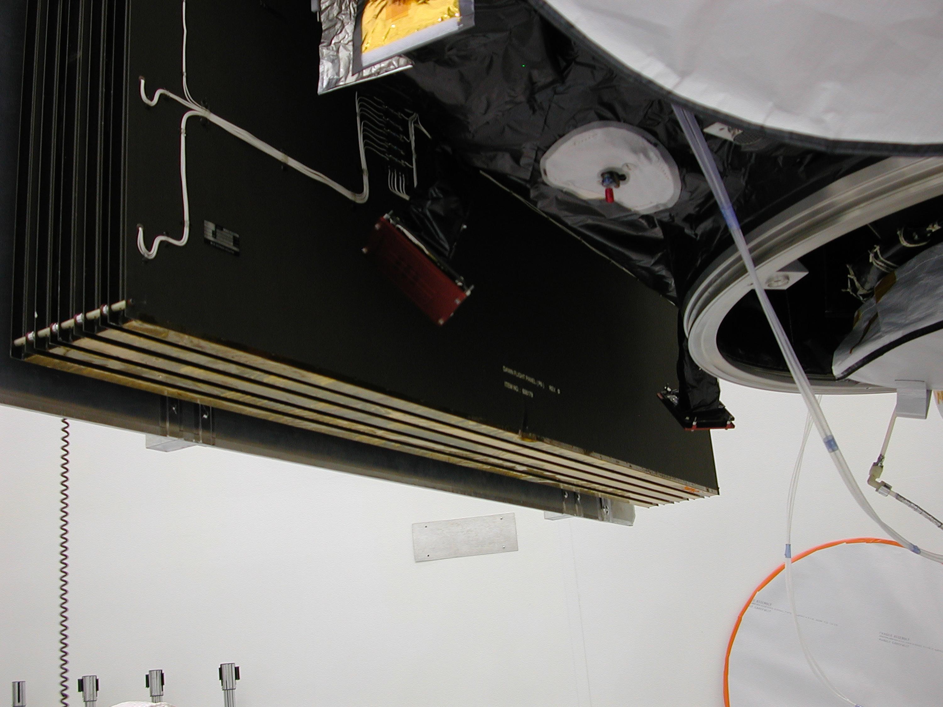 KENNEDY SPACE CENTER, FLA. -- On June 11, during a procedure to prepare the Dawn spacecraft for spin-balance testing, the back of a solar array panel was slightly damaged by a technician's tool. The size of the affected area is about 2.5 inches by 2 inches. The necessary minor repairs will be made during the coming weekend. There is no impact to the launch date of July 7. Dawn's goal is to characterize the conditions and processes of the solar system's earliest epoch 4.5 billion years ago by investigating in detail two of the largest asteroids, Ceres and Vesta. They reside between Mars and Jupiter in the asteroid belt. Photo courtesy of Orbital Sciences
