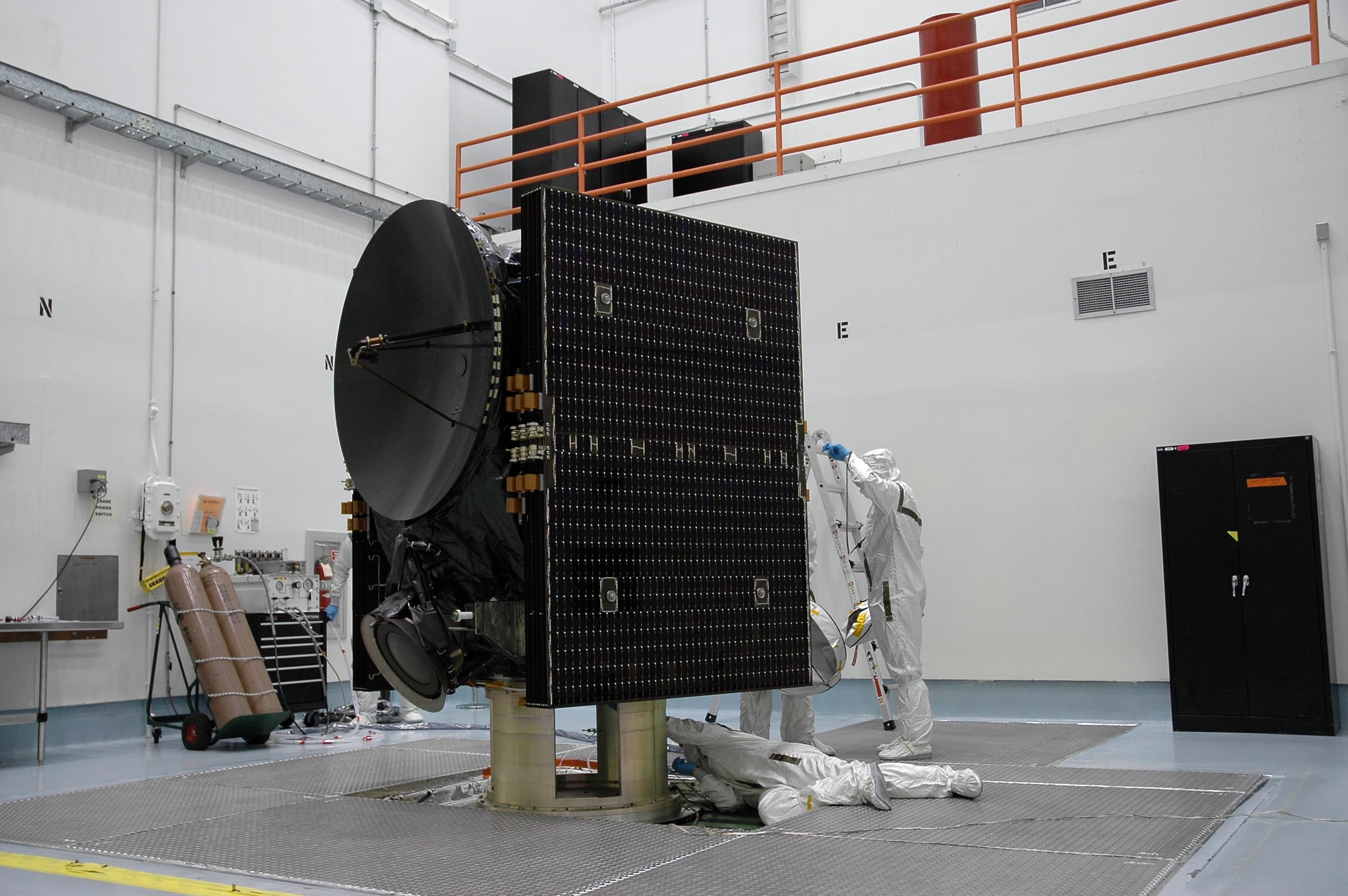 KENNEDY SPACE CENTER, FLA. -- Technicians at Astrotech prepare the Dawn spacecraft for spin-balance testing. After the test, Dawn will then be mated to the upper stage booster, installed into a spacecraft transportation canister for the trip to Cape Canaveral Air Force Station and mated to the Delta II rocket at Launch Pad 17-B. The Dawn spacecraft will employ ion propulsion to explore two of the asteroid belt's most intriguing and dissimilar occupants: asteroid Vesta and the dwarf planet Ceres. Dawn's goal is to characterize the conditions and processes of the solar system's earliest epoch by investigating in detail these largest protoplanets that have remained intact since their formations. Ceres and Vesta reside in the extensive zone between Mars and Jupiter together with many other smaller bodies, called the asteroid belt. Dawn is scheduled to launch July 7. Photo credit: NASA/Jack Pfaller