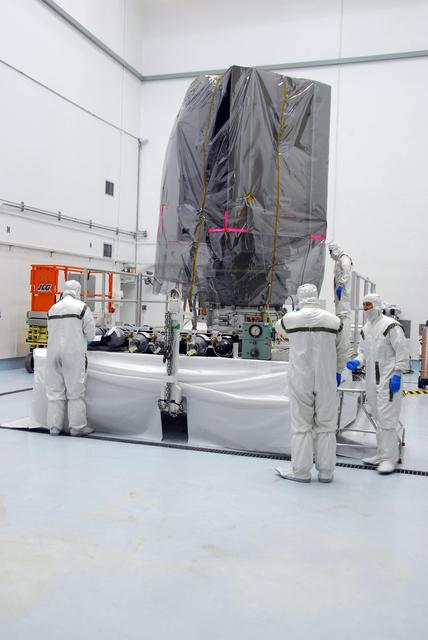 KENNEDY SPACE CENTER, FLA. -- At Astrotech, the Dawn spacecraft has been wrapped with a protective cover before it is enclosed in a canister. Dawn will be transported to Launch Pad 17-B and lifted into the mobile service tower for mating with the Delta II launch vehicle. The Delta II-Heavy, manufactured by the United Launch Alliance, is scheduled to launch the Dawn spacecraft on its 4-year flight to the asteroid belt. The Delta II-Heavy will use three stages and nine solid-fueled booster rockets to propel Dawn on its way. A 9.5-foot payload fairing will protect the spacecraft from the heat and stresses of launch. Dawn's goal is to characterize the conditions and processes of the solar system's earliest epoch by investigating in detail the largest protoplanets that have remained intact since their formations: asteroid Vesta and the dwarf planet Ceres. They reside in the extensive zone between Mars and Jupiter together with many other smaller bodies, called the asteroid belt. Dawn is scheduled to launch July 7. Photo credit: NASA/George Shelton