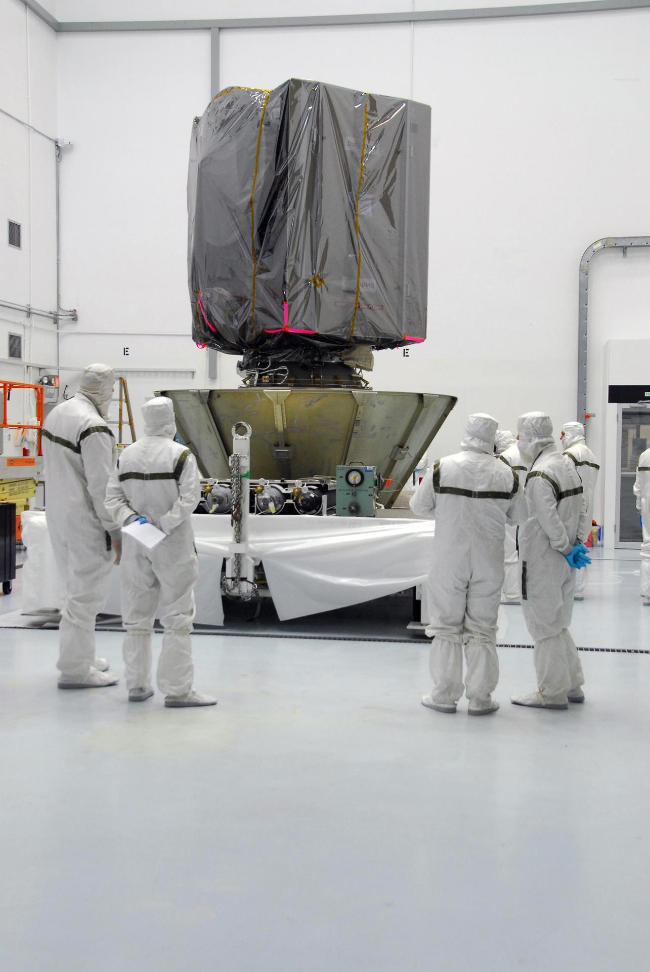 KENNEDY SPACE CENTER, FLA. -- At Astrotech, technicians examine the lower canister they placed around the bottom of the Dawn spacecraft. When enclosed in the canister, Dawn will be transported to Launch Pad 17-B and lifted into the mobile service tower for mating with the Delta II launch vehicle. The Delta II-Heavy, manufactured by the United Launch Alliance, is scheduled to launch the Dawn spacecraft on its 4-year flight to the asteroid belt. The Delta II-Heavy will use three stages and nine solid-fueled booster rockets to propel Dawn on its way. A 9.5-foot payload fairing will protect the spacecraft from the heat and stresses of launch. Dawn's goal is to characterize the conditions and processes of the solar system's earliest epoch by investigating in detail the largest protoplanets that have remained intact since their formations: asteroid Vesta and the dwarf planet Ceres. They reside in the extensive zone between Mars and Jupiter together with many other smaller bodies, called the asteroid belt. Dawn is scheduled to launch July 7. Photo credit: NASA/George Shelton