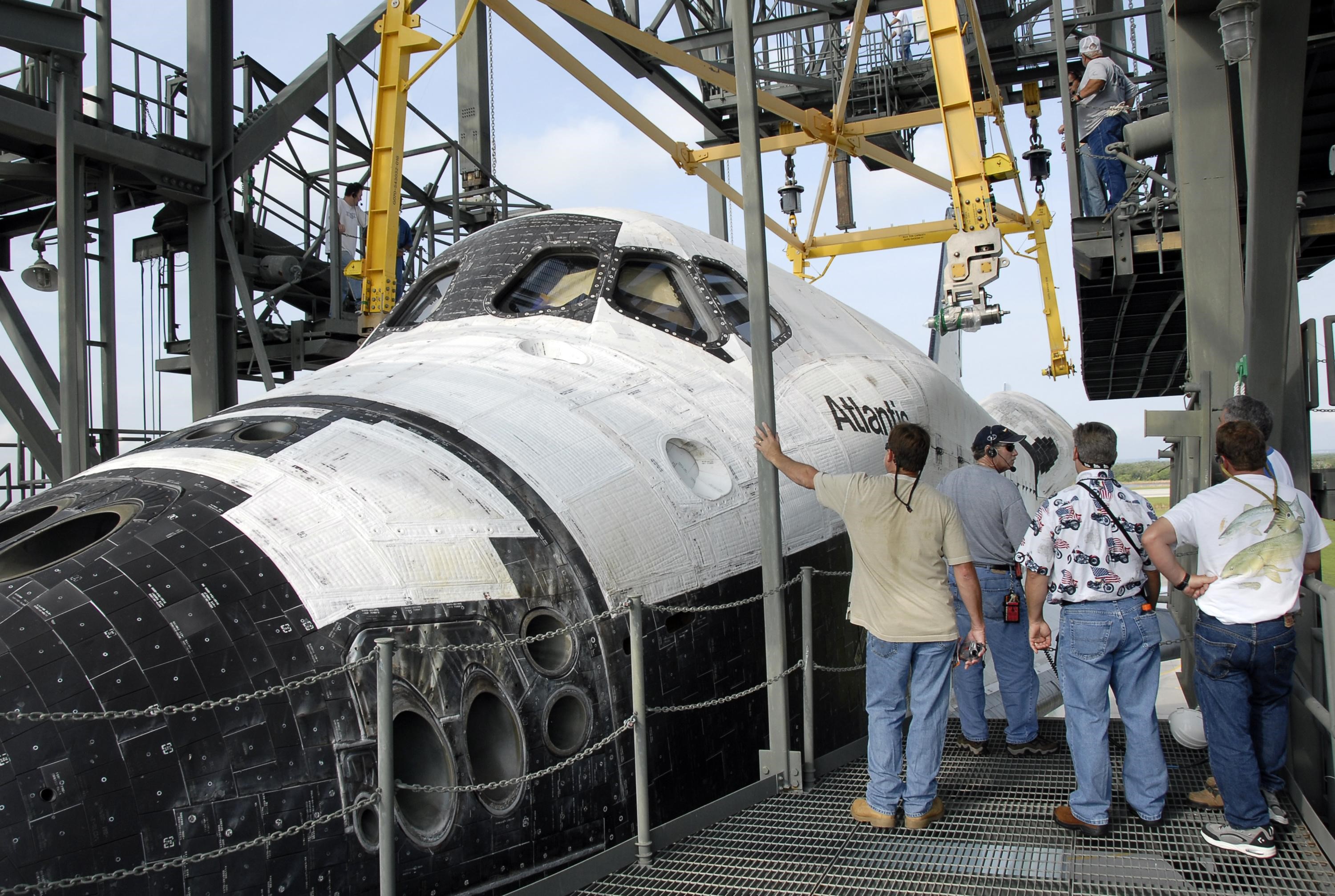 KENNEDY SPACE CENTER, FLA. -- On the KSC Shuttle Landing Facility, workers supervise the movement of the sling above the orbiter Atlantis. The sling will be attached and lift the orbiter away from the shuttle carrier aircraft (SCA) underneath. The SCA carried the orbiter piggyback from California. Atlantis landed at Edwards Air Force Base in California on June 22 to end mission STS-117. It returned to Kennedy atop the SCA on July 3 after a three-day, cross-country flight due to fuel stops and weather delays. Touchdown was at 8:27 a.m. EDT. Photo credit: NASA/Kim Shiflett