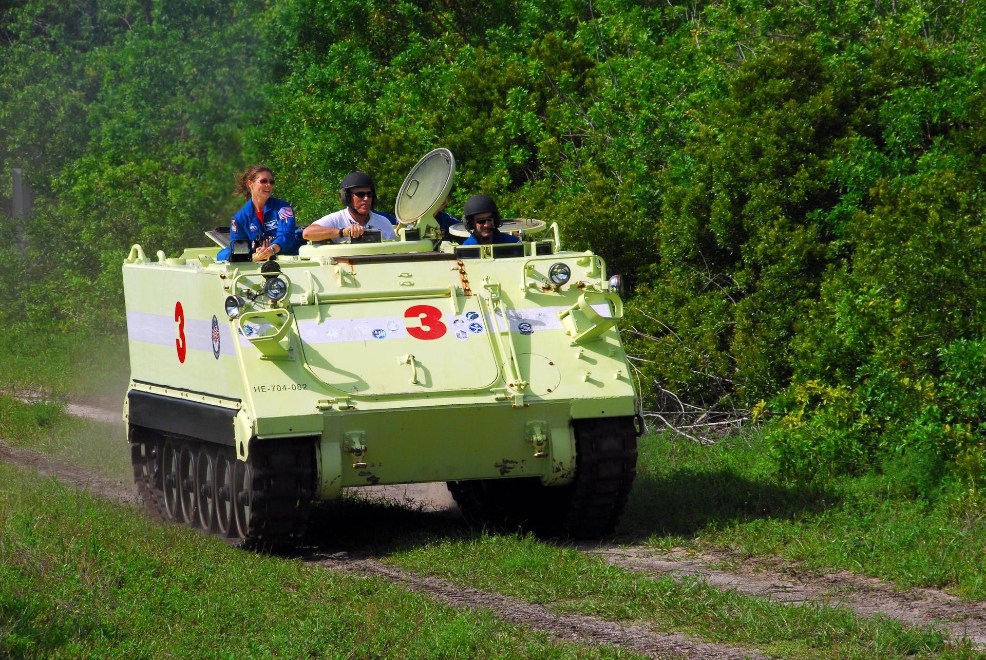 KENNEDY SPACE CENTER, Fla. -- STS-118 Pilot Charlie Hobaugh practices driving an M-113 armored personnel carrier with passenger (at left) Tracy Caldwell, mission specialist. They and other crew members are at Kennedy for the Terminal Countdown Demonstration Test (TCDT), a dress rehearsal for launch. TCDT activities include the M-113 training, payload familiarization, emergency egress training at the pad and a simulated launch countdown. The STS-118 payload aboard Space Shuttle Endeavour includes the S5 truss, a SPACEHAB module and external stowage platform 3. The mission is the 22nd flight to the International Space Station and is targeted for launch on Aug.7. NASA/George Shelton