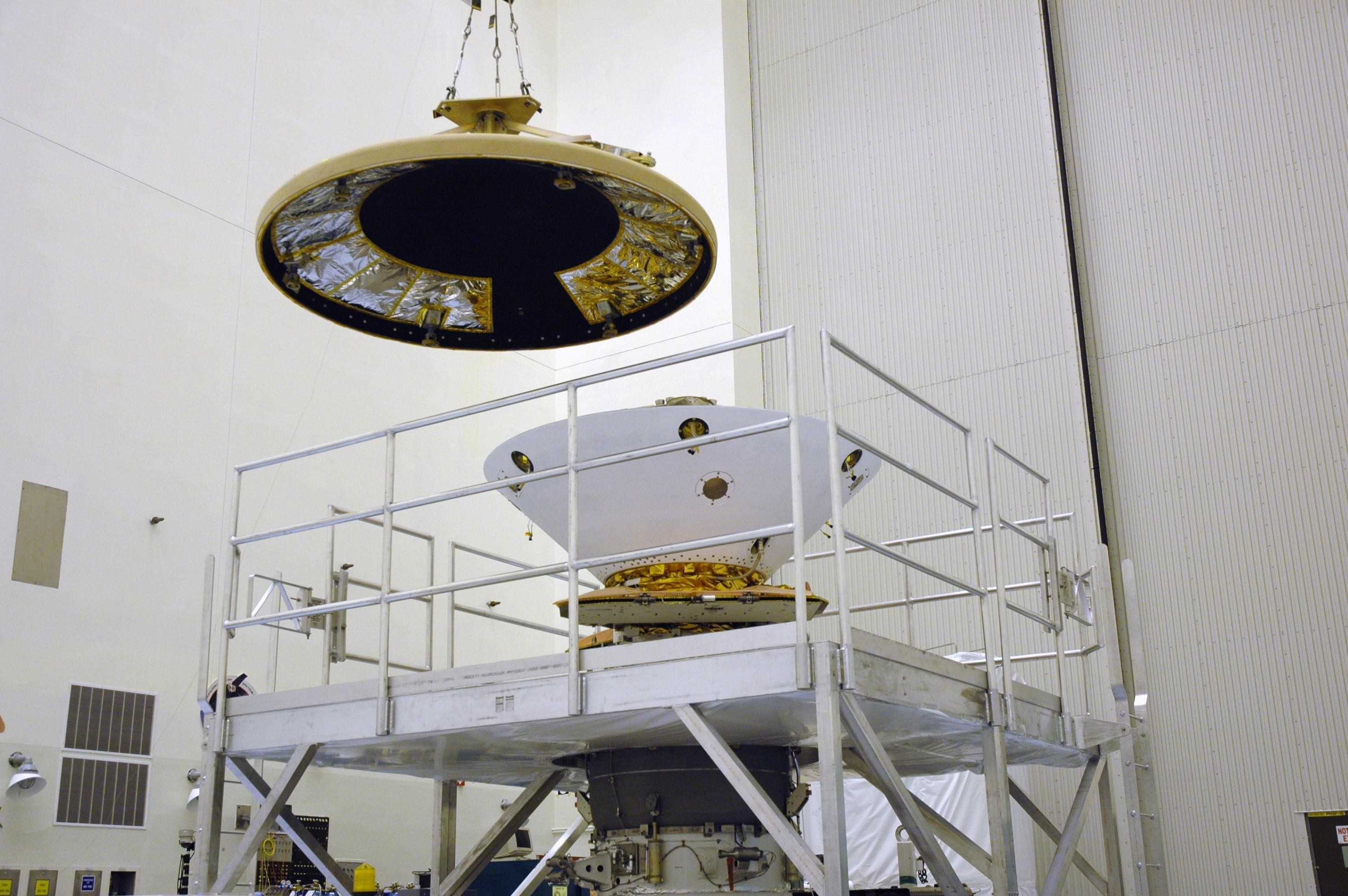 KENNEDY SPACE CENTER, Fla. --In the Payload Hazardous Servicing Facility, the heat shield for the Phoenix Mars Lander spacecraft is moved toward the spacecraft. Targeted for launch from Cape Canaveral Air Force Station on Aug. 3, Phoenix will land in icy soils near the north polar permanent ice cap of Mars and explore the history of the water in these soils and any associated rocks, while monitoring polar climate. Landing on Mars is planned in May 2008 on arctic ground where a mission currently in orbit, Mars Odyssey, has detected high concentrations of ice just beneath the top layer of soil. Photo credit: NASA/Troy Cryder