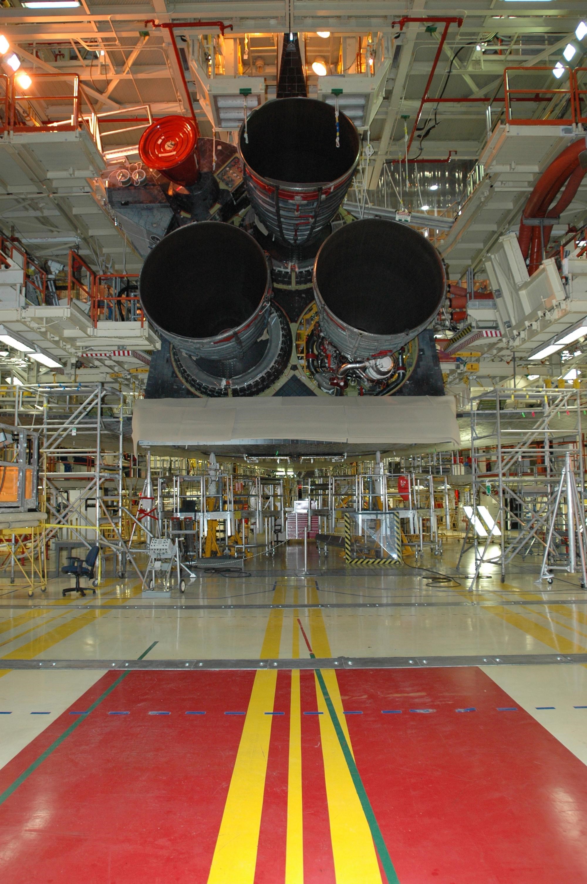 KENNEDY SPACE CENTER, FLA. -- Inside Orbiter Processing Facility 3 at Kennedy Space Center, the massive space shuttle main engines can be seen installed on orbiter Discovery during processing for mission STS-120. Mission STS-120 will be the 23rd flight to the International Space Station. Space Shuttle Discovery will carry the U.S. Node 2. Launch is targeted for Oct. 20. NASA/Dimitri Gerondidakis