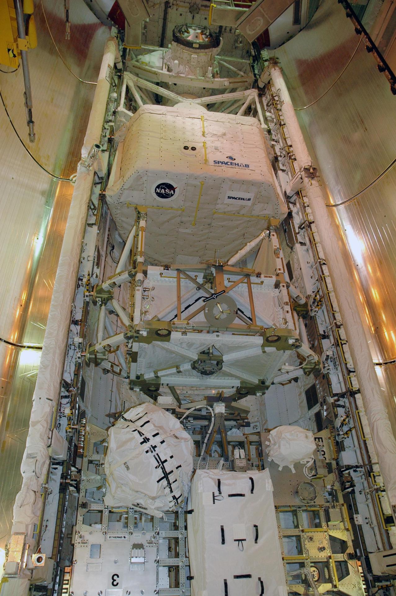 KENNEDY SPACE CENTER, FLA. -- On Launch Pad 39A, Endeavour's payload bay doors are open, revealing the cargo and equipment inside. At the top is the orbiter docking system; below it are the SPACEHAB module, the S5 truss and the external stowage platform 3 holding a control moment gyro at left and other supplies. The payload bay doors were opened to allow for payload closeouts, including camera tests on the shuttle robotic arm and the extension, known as the orbiter boom sensor system. Endeavour is scheduled to launch Aug. 7 on mission STS-118, the 22nd flight to the International Space Station. NASA/Charisse Nahser
