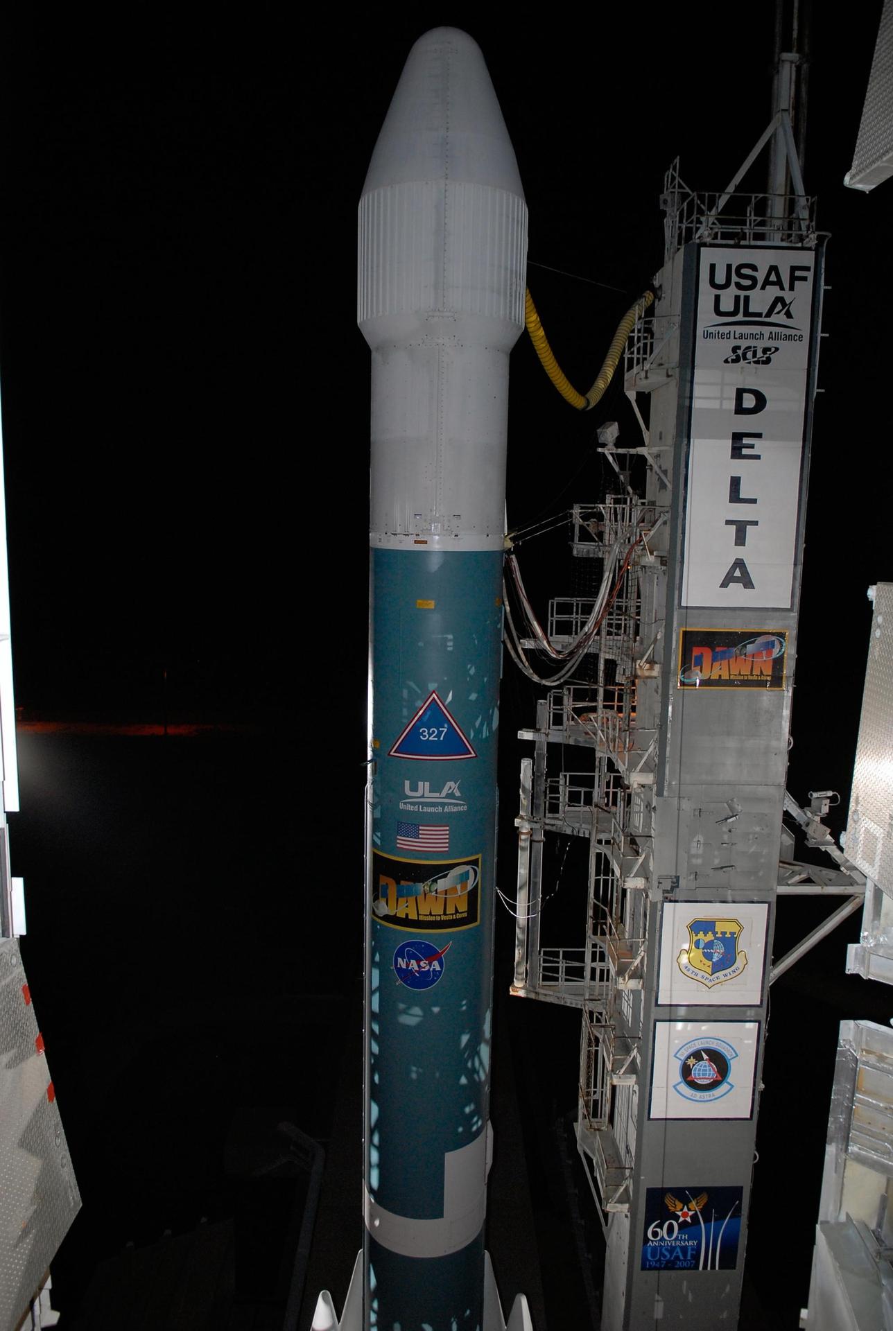 KENNEDY SPACE CENTER, FLA. -- The Delta II rocket stands ready for launch following rollback of the mobile service tower, or gantry, on Launch Pad 17B at Cape Canaveral Air Force Station. Starting with a boost from this higher thrust version of the Delta II rocket, the Dawn spacecraft will study the asteroid Vesta and dwarf planet Ceres, celestial bodies believed to have accreted early in the history of the solar system. To carry out its scientific mission during its nearly decade-long mission, Dawn will carry a visible camera, a visible and infrared mapping spectrometer, and a gamma ray and neutron spectrometer, whose data will be used in combination to characterize these bodies. In addition to the three instruments, radiometric and optical navigation data will provide data relating to the gravity field, and thus, bulk properties and internal structure of the two bodies. Data returned from the Dawn spacecraft could provide opportunities for significant breakthroughs in our knowledge of how the solar system formed. Launch is targeted for Sept. 27 during a window that extends from 7:20 to 7:49 a.m. EDT. Photo credit: NASA/Kim Shiflett