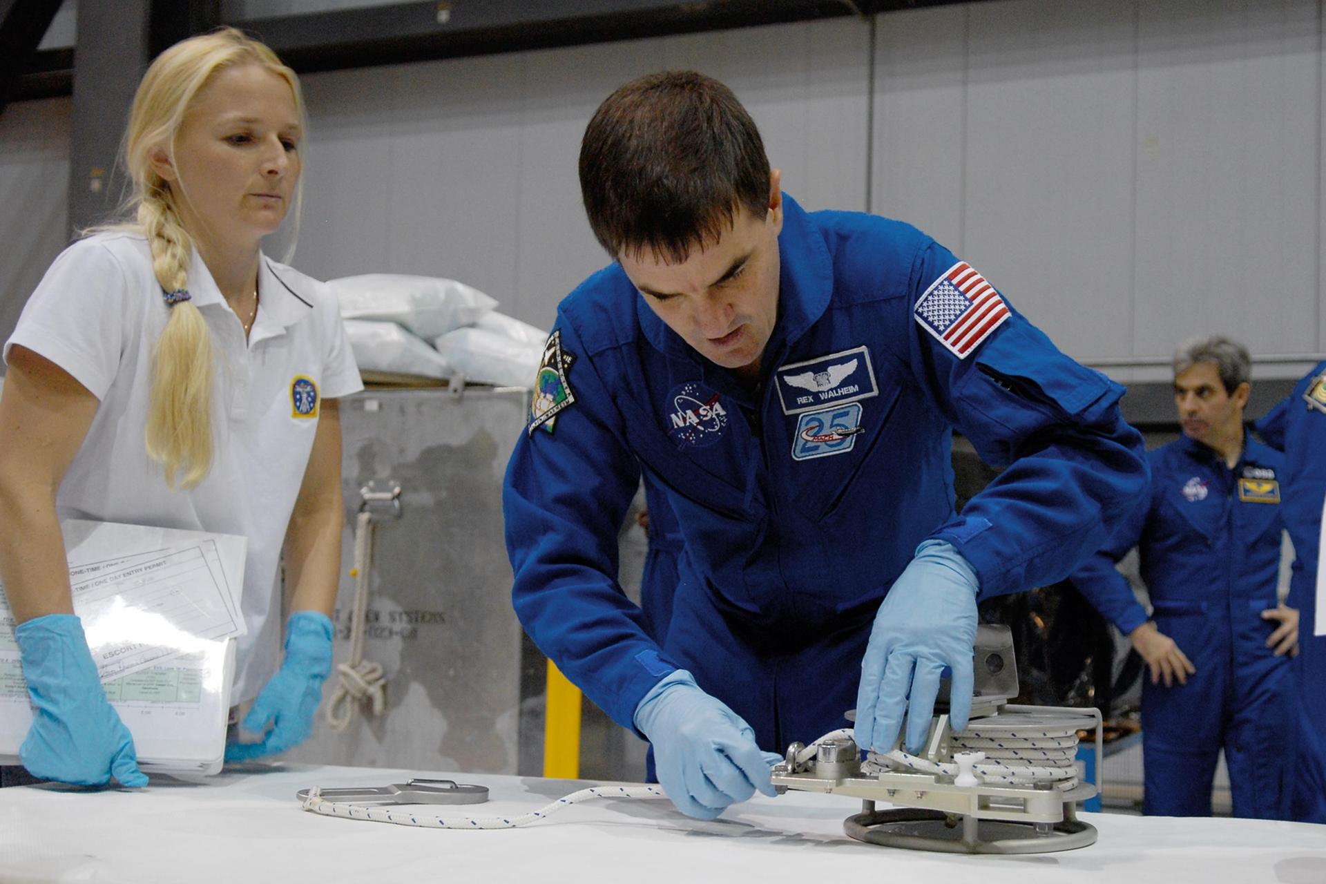 KENNEDY SPACE CENTER, FLA. -- In the Orbiter Processing Facility, STS-122 Mission Specialist Rex Walheim practices working with equipment for the mission. In the background, at right, is European Space Agency astronaut Leopold Eyharts, who will be on the mission and joining the Expedition 16 crew as flight engineer on the International Space Station. The crew is at Kennedy Space Center to take part in a crew equipment interface test, which includes equipment familiarization. The mission will carry and install the Columbus Lab, a multifunctional, pressurized laboratory that will be permanently attached to Node 2 of the space station to carry out experiments in materials science, fluid physics and biosciences, as well as to perform a number of technological applications. It is Europe’s largest contribution to the construction of the International Space Station and will support scientific and technological research in a microgravity environment. STS-122 is targeted for launch in December. Photo credit: NASA/Kim Shiflett