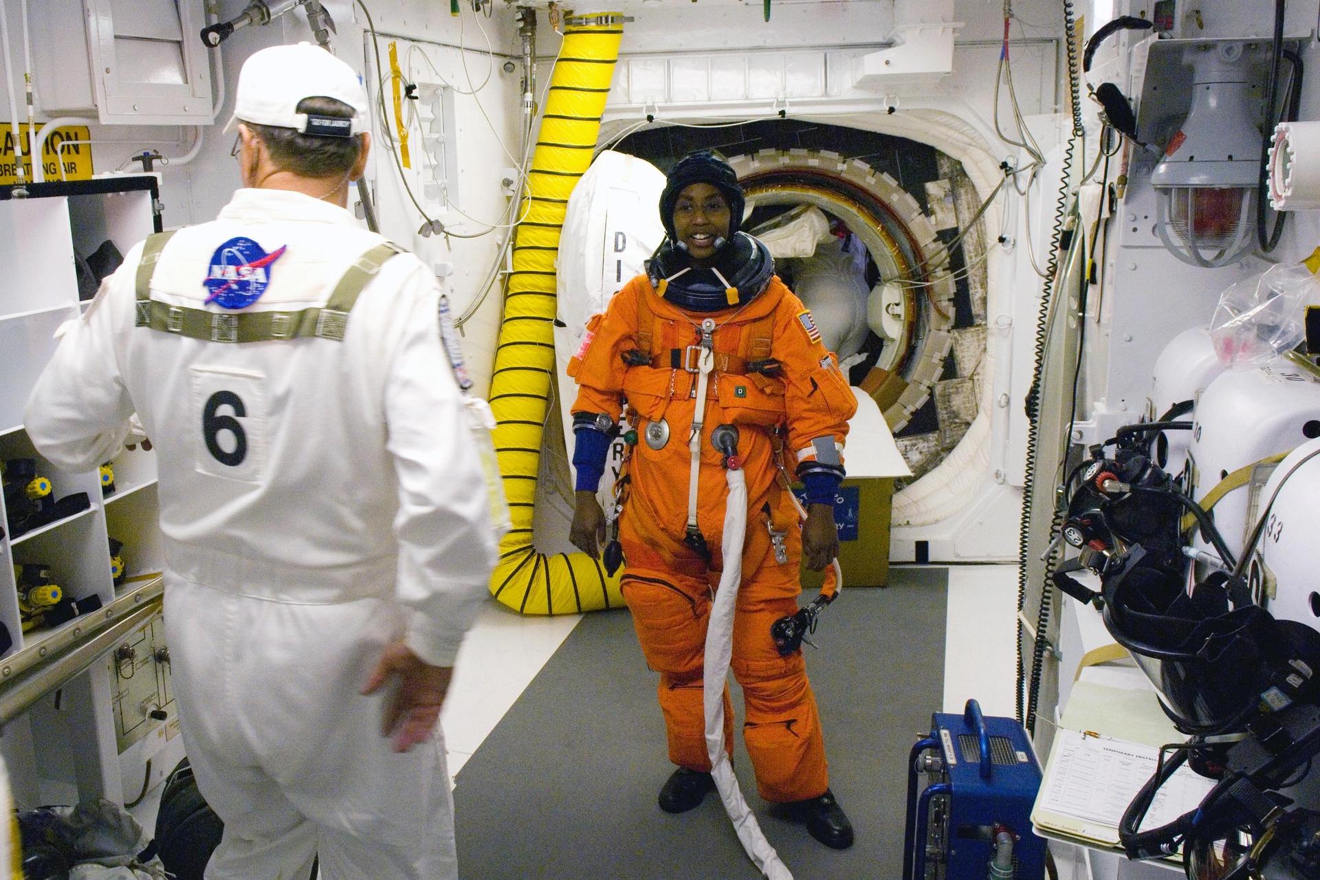 KENNEDY SPACE CENTER, FLA. -- In the White Room on Launch Pad 39A at NASA's Kennedy Space Center, STS-120 Mission Specialist Stephanie Wilson waits her turn to enter space shuttle Discovery for liftoff at 11:38 a.m. EDT. The closeout crew helped her to put on a parachute and prepare her launch and entry suit for the launch. The STS-120 mission will be the 23rd assembly flight to the space station and the 34th flight for Discovery. Payload on the mission is the Italian-built U.S. Node 2, called Harmony. During the 14-day mission, the crew will install Harmony and move the P6 solar arrays to their permanent position and deploy them. Discovery is expected to complete its mission and return home at 4:47 a.m. EST on Nov. 6. Photo credit: NASA/Scott Haun, Tom Farrar, Rafael Hernandez